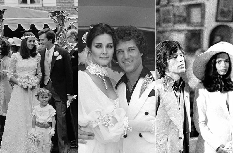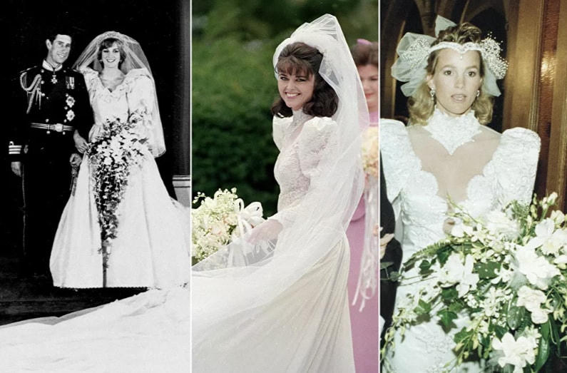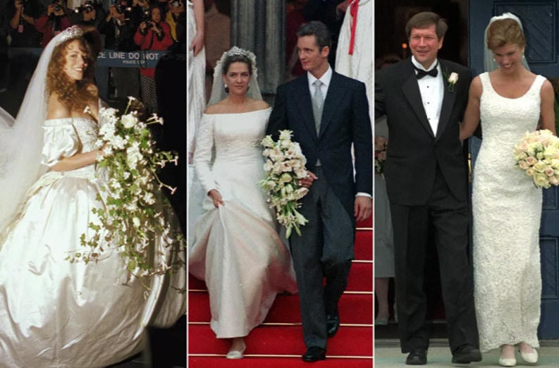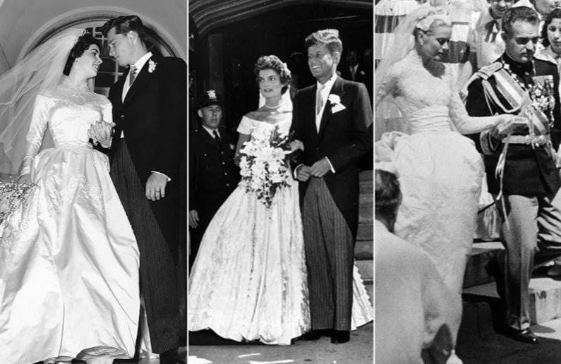 Từ trái qua: Công chúa María de las Mercedes của Two Sicilies với chồng là Infante Juan của Tây Ban Nha, ngày 12/10/1935; Cô Nancy Beaton (người Anh) cùng chồng Sir John Smiley, ngày 18/1/1933; Cô Dorothy Mary Dennis sau đám cưới của cô với vận động viên cricket, đội trưởng đội tuyển quốc gia Anh Leonard Hutton, ngày 16/9/1939.Từ trái qua: Công chúa Alexandra của Hy Lạp và Đan Mạch trong đám cưới của cô với Vua Peter II của Nam Tư vào ngày 20/3/944; Lady Sarah Consuelo Spencer-Churchill với chồng, Trung úy Edwin Russell vào ngày 15/5/1943; Nữ hoàng tương lai của Vương quốc Anh Elizabeth II với chồng Philip, Công tước xứ Edinburgh, ngày 20/11/1947.Từ trái qua: Nữ diễn viên Elizabeth Taylor với Conrad Hilton Jr. vào ngày 6/5/1950; Jacqueline Kennedy với Tổng thống tương lai của Mỹ, John Fitzgerald Kennedy vào ngày 12/9/1953; Nữ diễn viên Grace Kelly sau đám cưới của cô với Hoàng tử Monaco Rainier III vào ngày 19/4/1956.Từ trái qua: Nữ diễn viên Thụy Điển Britt Ekland với chồng, nam diễn viên người Anh Peter Sellers vào ngày 19/2/1964; Nghệ sĩ Nhật Bản Yoko Ono sau đám cưới của cô với nhạc sĩ, trưởng nhóm nhạc huyền thoại The Beatles, John Lennon, ngày 20/3/1969; Nữ diễn viên người Anh Amanda Barrie với chồng, nam diễn viên Robin Hunter, ngày 19/6/1967.Từ trái qua: Con gái của nhà quý tộc Ý, Olympia Aldobrandini với chồng (Nam tước) David de Rothschild trong đám cưới vào mùa hè năm 1974 của họ ở Normandy; Nữ diễn viên Lynda Carter với chồng, nhà sản xuất Ron Samuels, ngày 28/5/1977; Nhà vận động nhân quyền Blanca Pérez-Mora Macías trong đám cưới của cô với nhạc sĩ nhạc người Anh, ca sĩ chính của nhóm nhạc Rolling Stones, Mick Jagger, ngày 12/5/1971.Từ trái qua: Công nương xứ Wales Diana trong đám cưới với Hoàng tử xứ Wales Charles, ngày 29/7/1981; Nhà báo người Mỹ Maria Shriver trước đám cưới của cô với nam diễn viên, Thống đốc tương lai của California, Arnold Schwarzenegger, vào ngày 26/4/1986; nữ diễn viên Janet Jones Gretzky trước đám cưới của cô với vận động viên khúc côn cầu người Canada Wayne Gretzky, ngày 16/7/1988.Từ trái qua: Ca sĩ Mariah Carey kết hôn với nhà sản xuất Tommy Mottola vào ngày 5/61993; Infanta Cristina của Tây Ban Nha trong đám cưới với cầu thủ bóng ném Tây Ban Nha Iñaki Urdangarin,ngày 4/10/1997; Nữ doanh nhân người Mỹ Karen Waldbillig Kasich và chính trị gia người Mỹ John Kasich, ngày 22/3/1997.Từ trái qua: Một người mẫu trình diễn chiếc váy từ bộ sưu tập mùa xuân của Vera Wang tại Tuần lễ Áo cưới New York, ngày 17/4/2008; Yekaterina Dmitrieva Malenchenko tạo dáng gần một bức tượng bằng bìa cứng của chồng cô, phi hành gia, Anh hùng dân tộc của Nga, Yuri Malenchenko trong lễ cưới được tổ chức qua liên kết vệ tinh vào ngày 10/8/2003; Nhà thiết kế người Ý Antonio D'Amico với một người mẫu Pháp trong buổi trình diễn ở Milan vào ngày 26/9/1999.Từ trái qua: Kate Middleton, Nữ công tước xứ Cambridge trong đám cưới của cô với Hoàng tử William, Hoàng tử Cambridge, vào ngày 29/4/2011; Nữ diễn viên Ấn Độ Priyanka Chopra với chồng, nhạc sĩ Nick Jonas, ngày 20/2/2018; một người mẫu trình diễn trang phục của nhà thiết kế người Lebanon Reem Acra trong Tuần lễ Áo cưới ở New York, ngày 11/4/2019.
