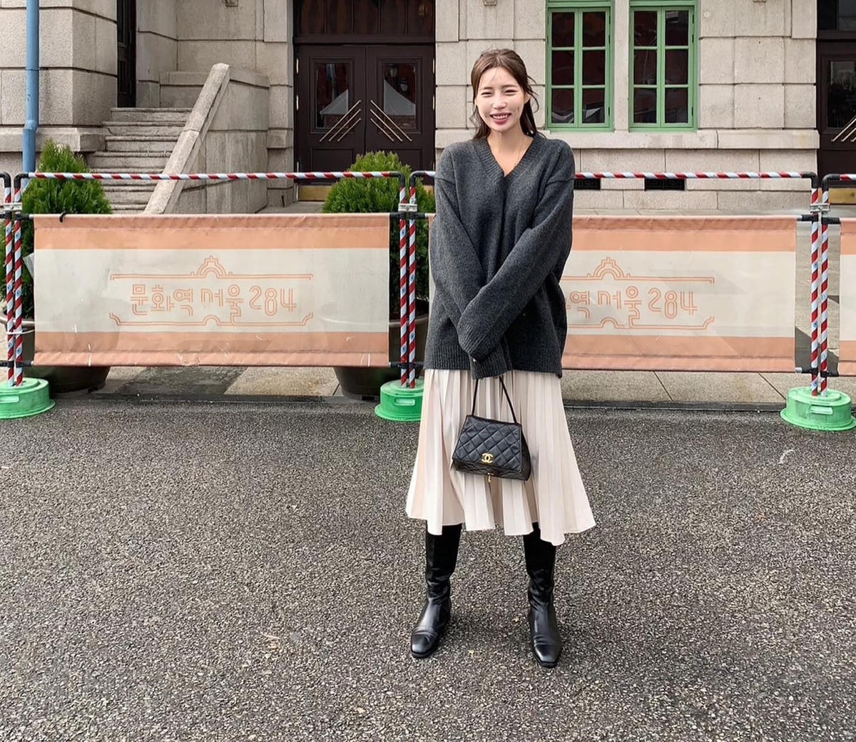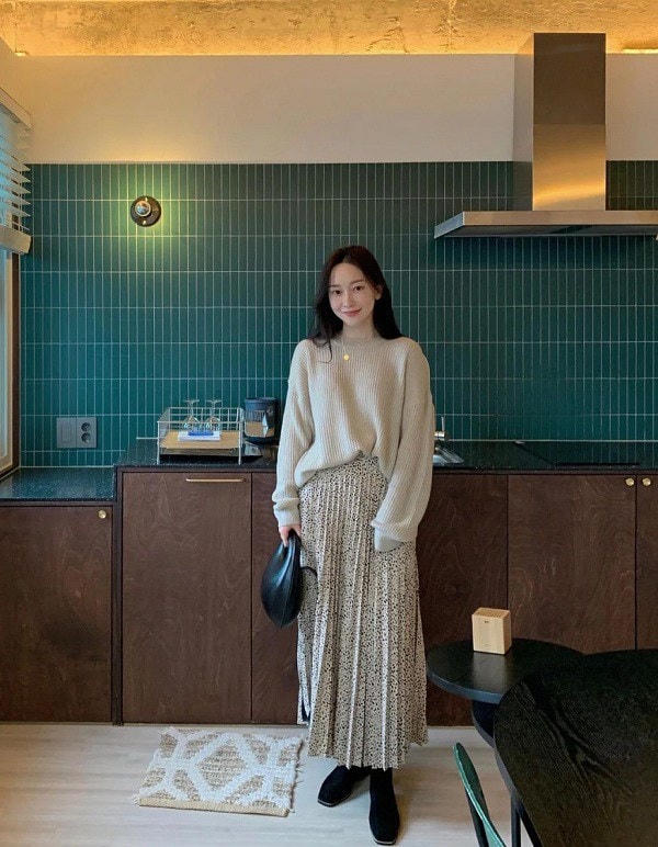 Sắm một chiếc chân váy xếp ly màu trắng, bạn sẽ biến hóa được nhiều phong cách khác nhau. Chẳng hạn như khi kết hợp chân váy xếp ly trắng cùng áo len oversized, và đi boots, người diện có được vẻ ngoài phóng khoáng, nhưng cũng không kém phần nữ tính.