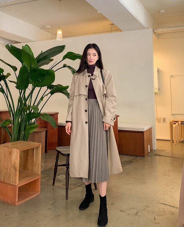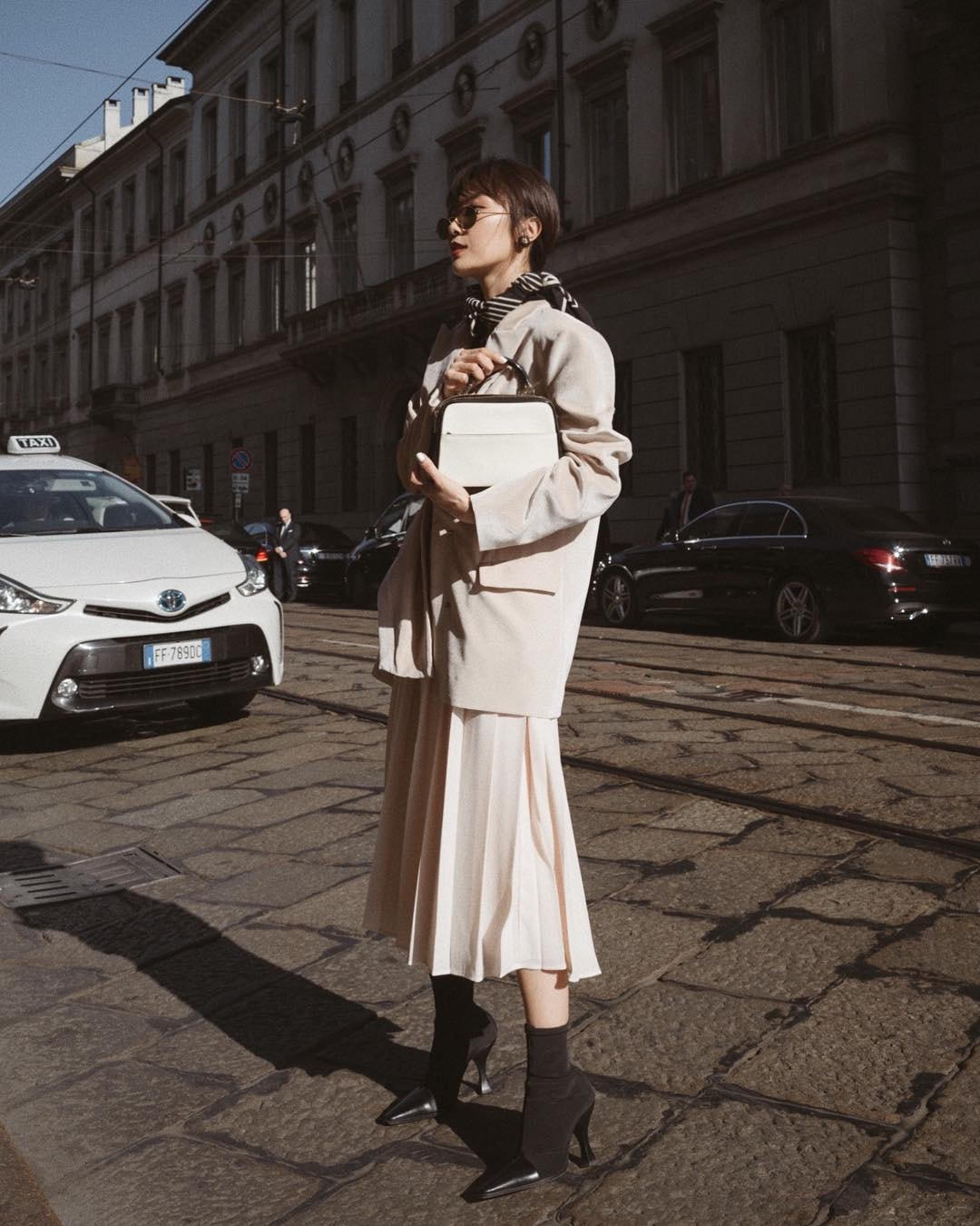 Sự kết hợp giữa chân váy xếp ly và áo blazer giúp nhân đôi vẻ thanh lịch cho người diện. Chiếc khăn họa tiết quàng cổ, boots mũi nhọn đều có tác dụng nâng tầm nét sang trọng. Đây là công thức lý tưởng để áp dụng trong những dịp trang trọng.
