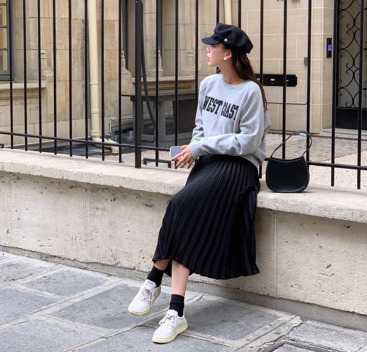 Yêu thích phong cách năng động thì các nàng đừng bỏ qua công thức gồm: áo nỉ, chân váy xếp ly và sneaker trắng. Tổng thể trang phục giúp người diện thêm trẻ trung. Bên cạnh đó, bộ đồ vẫn toát lên sự nữ tính, yêu kiều nhờ chiếc mũ nồi và đôi khuyên tai ngọc trai.