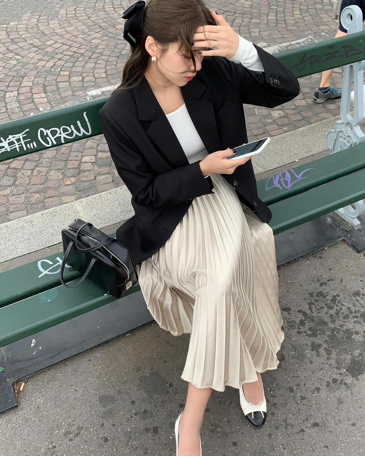 Sự kết hợp giữa chân váy xếp ly và áo blazer giúp nhân đôi vẻ thanh lịch cho người diện.