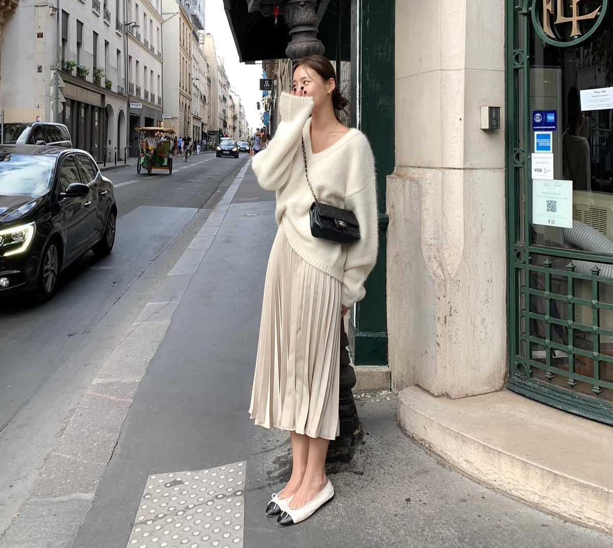 Áo len và chân váy là "cặp bài trùng" hoàn hảo, đem đến cho người diện vẻ ngoài nữ tính, thanh lịch. Vì mang tông màu trắng làm chủ đạo nên set đồ toát lên sự tinh tế, trẻ trung. Đôi giày búp bê gắn nơ rất phù hợp với nét dịu dàng của tổng thể outfit.