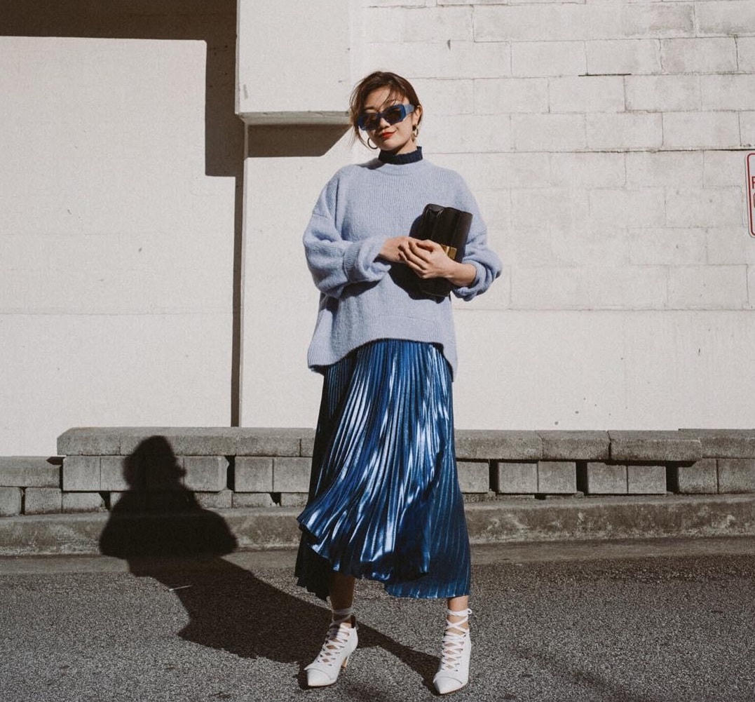 Mẫu chân váy xếp ly mang tông màu xanh, vải lụa chính là điểm nhấn sang trọng của cả set trang phục. Chiếc áo len xanh pastel đã tăng thêm sự trẻ trung cho outfit, mà vẫn đồng điệu với chân váy xếp ly. Công thức trên không hề kén dáng, chị em nào cũng có thể mặc đẹp.