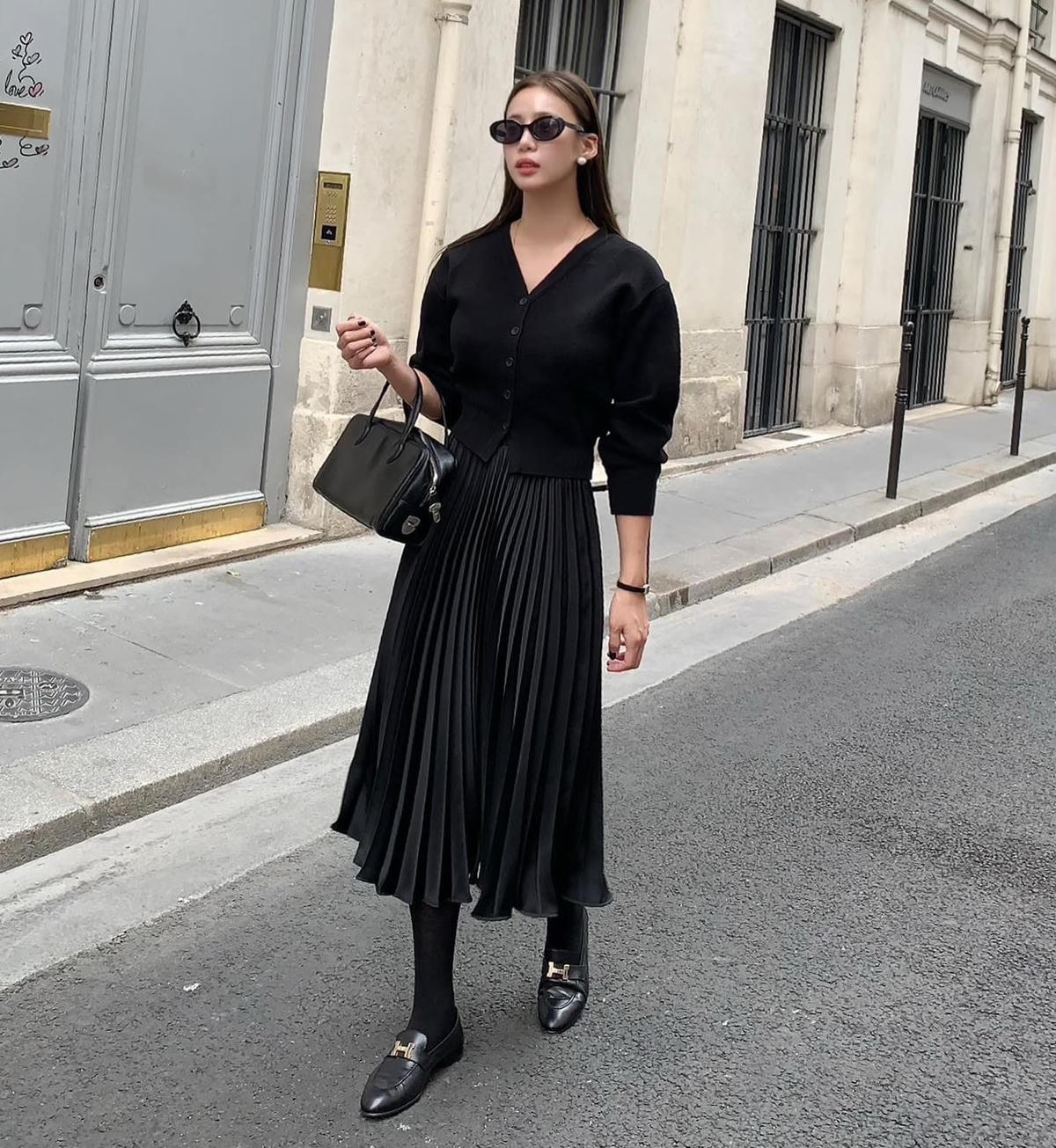 Đơn giản nhưng không hề nhàm chán là combo áo cardigan, chân váy xếp ly và loafer cùng tông màu đen. Mẫu áo cardigan dáng lửng cho hiệu quả hack chiều cao. Diện trang phục màu đen thì bạn nên tô son đỏ để tăng vẻ sang trọng.