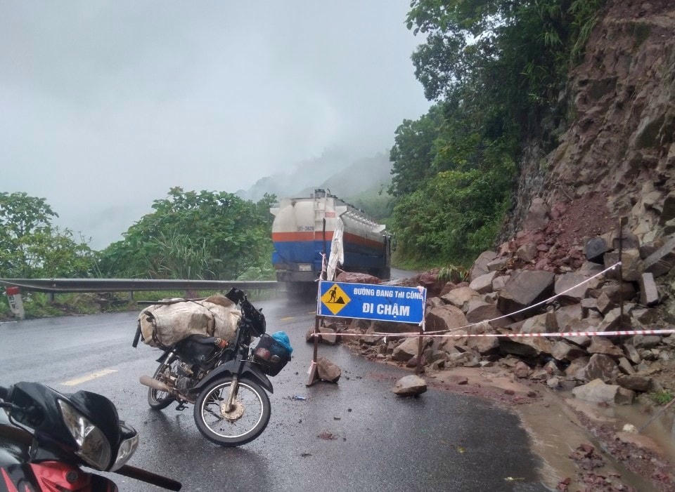 Dù xuất hiện một số điểm sạt lở khiến đất đá tràn ra đường, tuy nhiên, các phương tiện vẫn có thể lưu thông qua tuyến QL 15D.