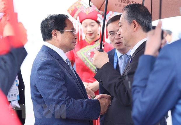 Ra sân bay quốc tế Nam Ninh đón Thủ tướng Chính phủ Phạm Minh Chính và Đoàn đại biểu Việt Nam, về phía Trung Quốc có Thường vụ Khu ủy, Trưởng ban Tổ chức Khu ủy Quảng Tây Vương Duy Bình; Đại sứ Trung Quốc tại Việt Nam Hùng Ba; Phó Giám đốc Sở Ngoại vụ Quảng Tây Chu Đồng.