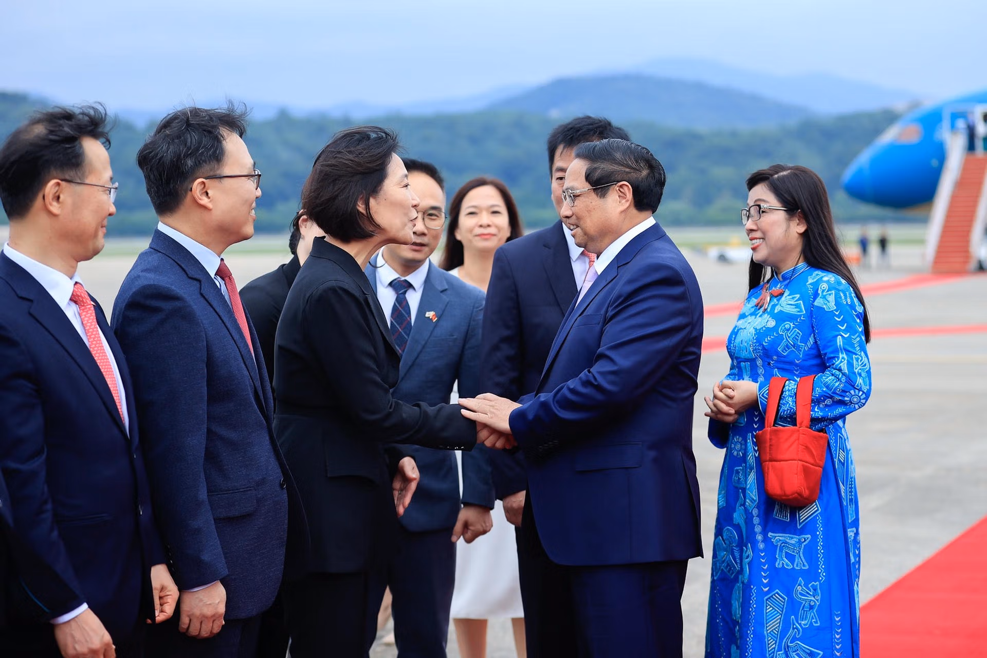 Cục trưởng Cục Lễ tân, Bộ Ngoại giao Hàn Quốc và Đại sứ Việt Nam tại Hàn Quốc lên tận máy bay đón mời Thủ tướng Phạm Minh Chính và Phu nhân. Bộ trưởng Bộ Doanh nghiệp vừa và nhỏ và Khởi nghiệp Hàn Quốc chào đón Thủ tướng và Phu nhân tại chân cầu thang máy bay.