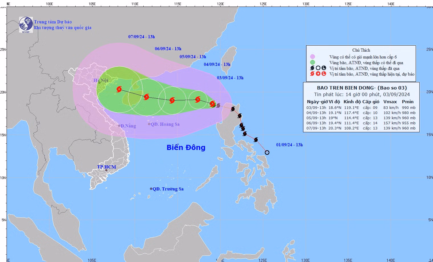 Dự báo, bão số 3 sẽ tiếp tục mạnh thêm, sức gió mạnh nhất trên biển có thể đạt cấp 13, giật cấp 16 trong những ngày tới, di chuyển nhanh về phía đảo Hải Nam (Trung Quốc) và khu vực Vịnh Bắc Bộ, khả năng rất cao ảnh hưởng trực tiếp đến vùng biển và đất liền khu vực Bắc Bộ và Bắc Trung Bộ của Việt Nam.