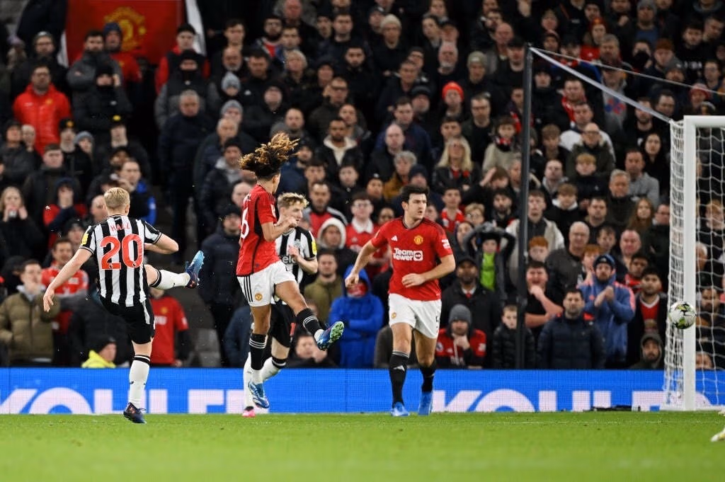 Phút 28, Livramento giành bóng từ sân nhà lao lên đầy mạnh mẽ, các cầu thủ Man Utd không ngăn nổi hậu vệ phải của Newcastle dâng cao. Sau đó Livramento chuyền bóng cho Almiron, cầu thủ người Hà Lan lao lên ở bên trái trung lộ rồi xâm nhập vòng cấm địa và dứt điểm, bóng đi chéo góc quá nhanh khiến Onana không kịp cản phá. Newcastle vượt lên dẫn trước 1-0.