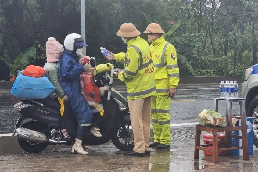 Lực lượng CSGT Công an tỉnh Thừa Thiên - Huế đã tiến hành phát nước uống và thức ăn nhanh cho người dân trên đường trở lại các tỉnh, thành làm việc sau kỳ nghỉ Tết Nguyên đán.