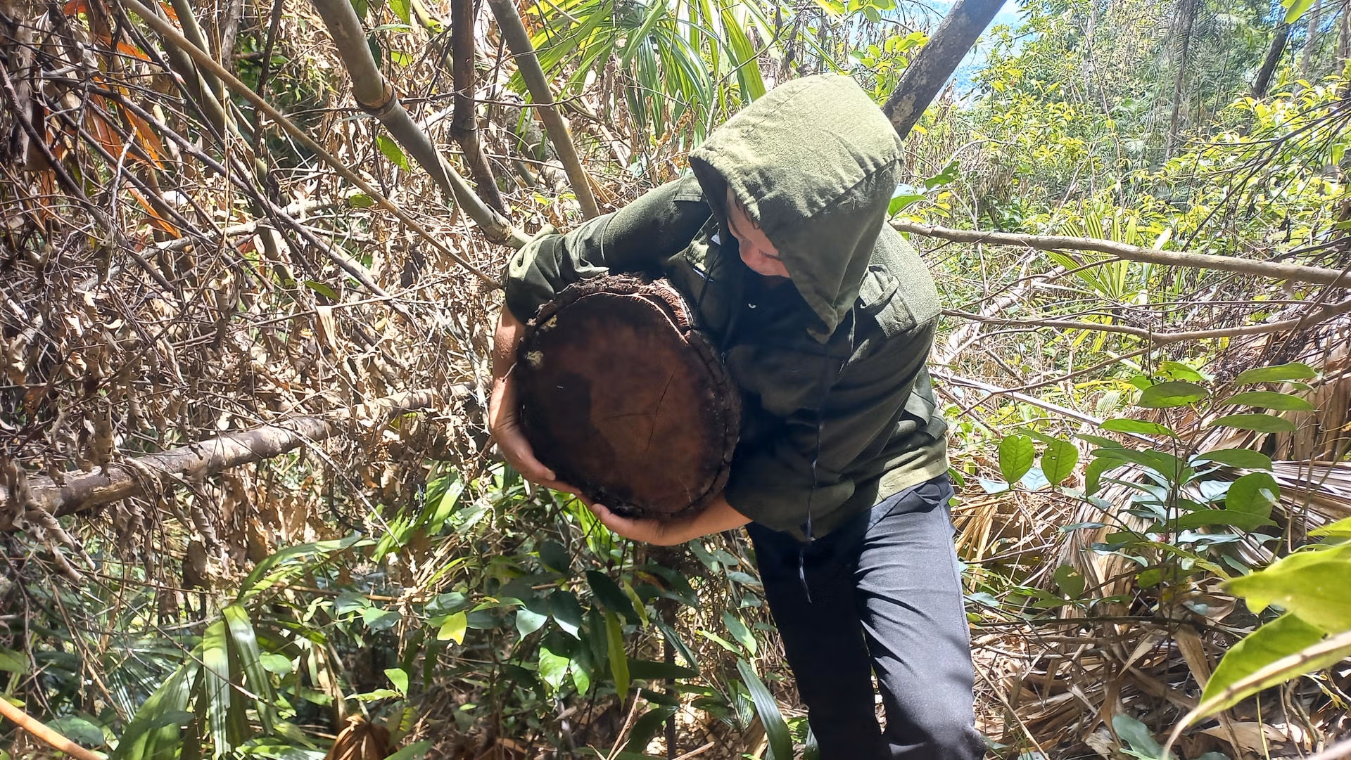 Vừa đi, anh T. vừa chỉ dẫn, “thấy chỗ nào mà cây dây leo, cây nhỏ bị đổ rạp xuống và nhìn thấy thoáng, sáng thì khả năng là nơi đó có cây gỗ lớn mới bị đốn hạ”.