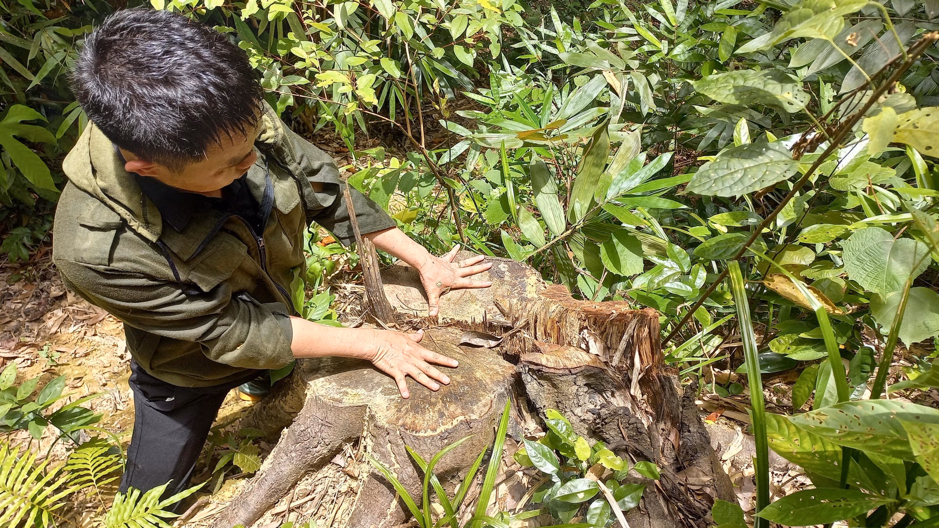 Điển hình, có gốc cây đường kính rộng hơn 2 gang tay người lớn. Cách gốc cây này chừng vài mét là hiện trường “lâm tặc” đã dùng để cưa xẻ gỗ thành các phách trước khi đưa ra khỏi rừng.