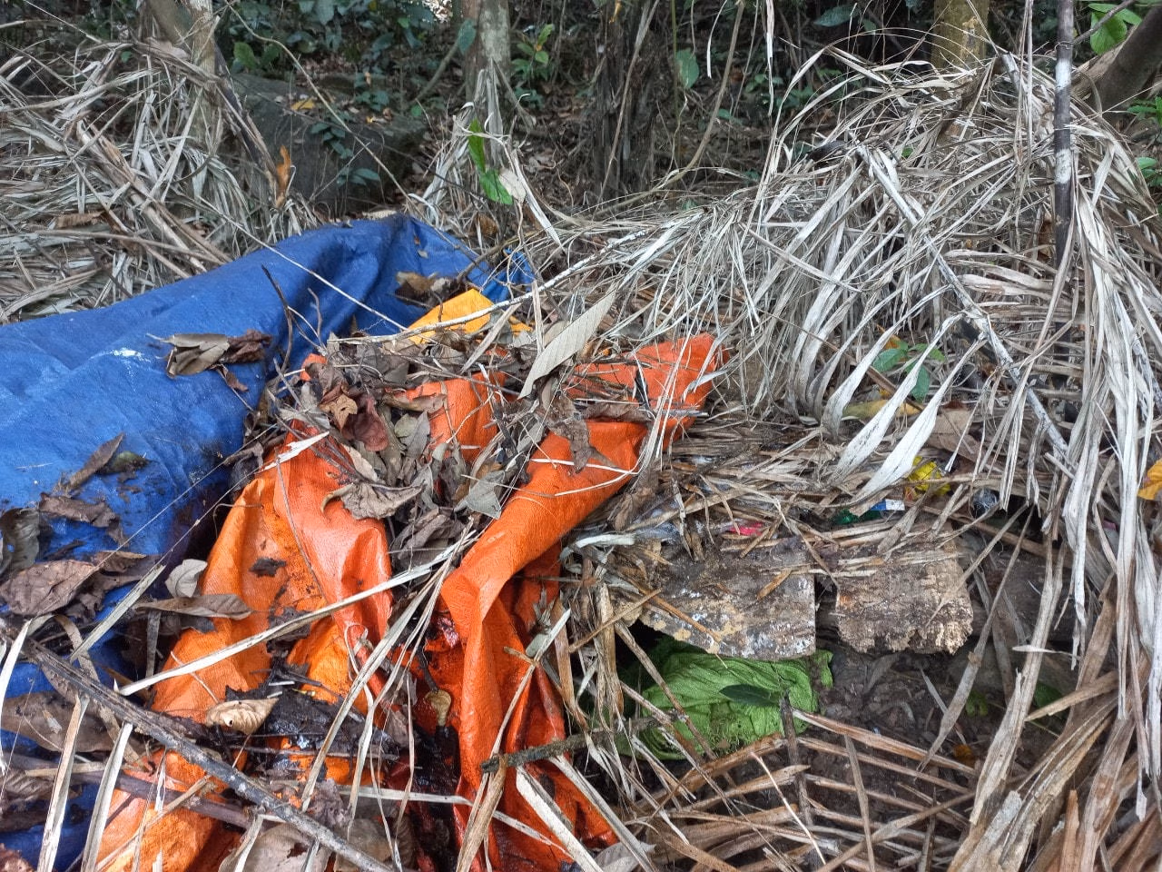 Đi thêm một đoạn chúng tôi bắt gặp hình ảnh lán trại nằm ngay sát con suối nép bên bìa rừng với những vật dụng như xoong nồi được vứt lại nằm ngổn ngang. Anh H. nhận định, lán này là của “lâm tặc” để lại.