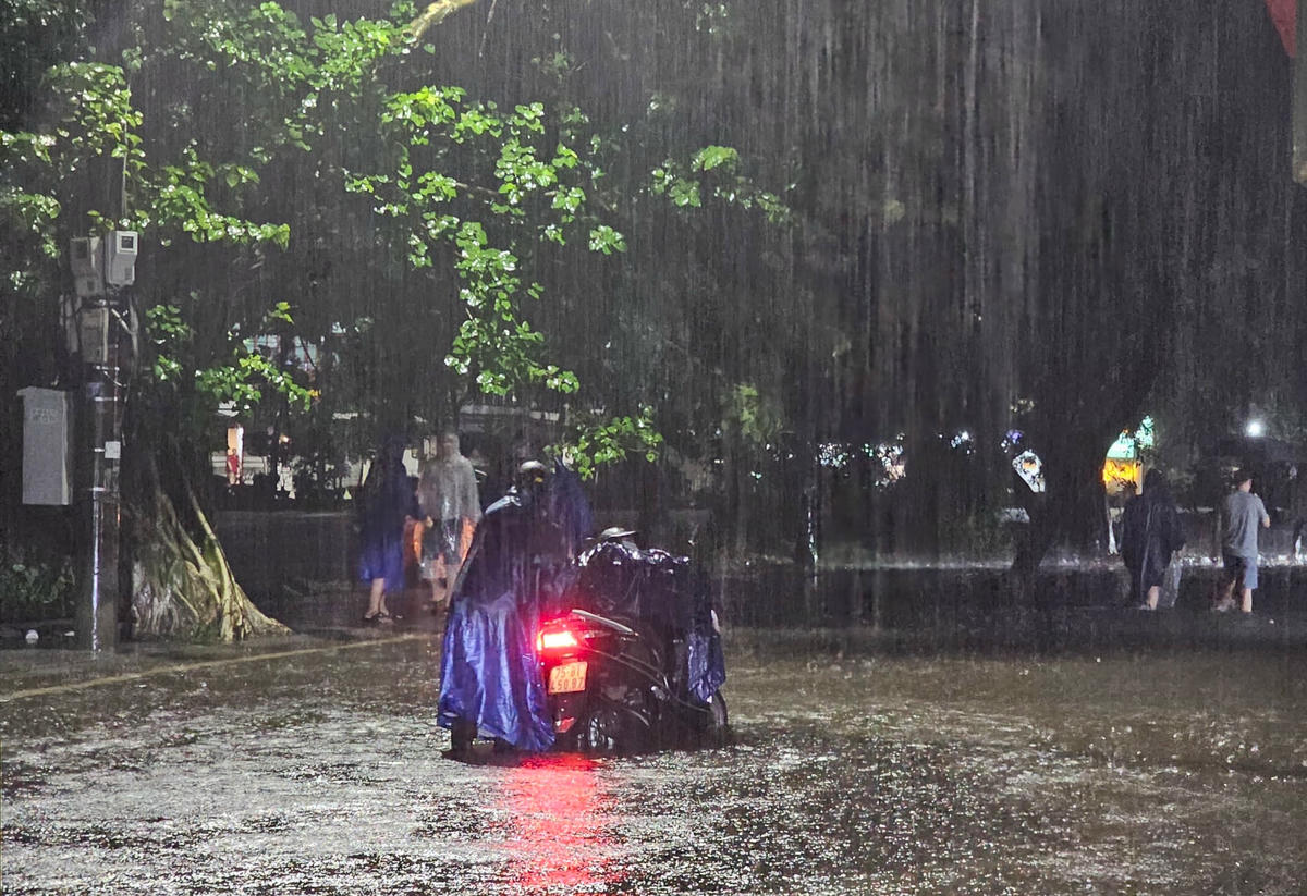 Mưa lớn trong đêm 14/11 khiến nhiều tuyến đường trung tâm thành phố Huế như Bà Triệu, Phan Đình Phùng… bị ngập lụt, giao thông đi lại vô cùng khó khăn.