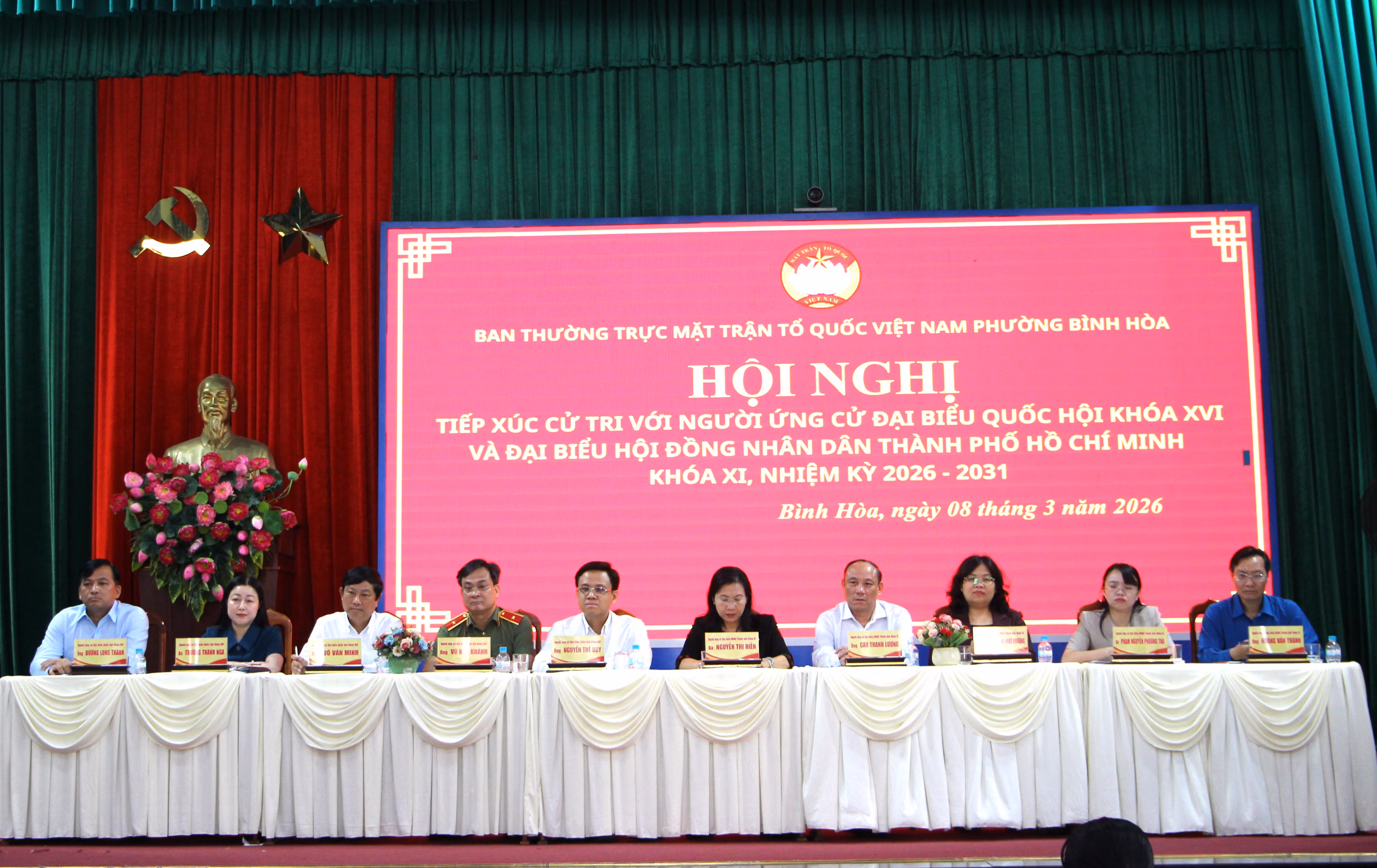 Chiều 8/3, tại phường Bình Hoà, TP Hồ Chí Minh đã diễn ra buổi tiếp xúc cử tri với các ứng cử viên đại biểu Quốc hội khoá XVI và đại biểu HĐND thành phố khóa XI, nhiệm kỳ 2026-2031. Dự hội nghị có 10 ứng cử viên, trong đó có 5 ứng cử viên đại biểu Quốc hội (Đơn vị bầu cử số 1) và 5 ứng viên đại biểu HĐND thành phố (Đơn vị bầu cử số 3).