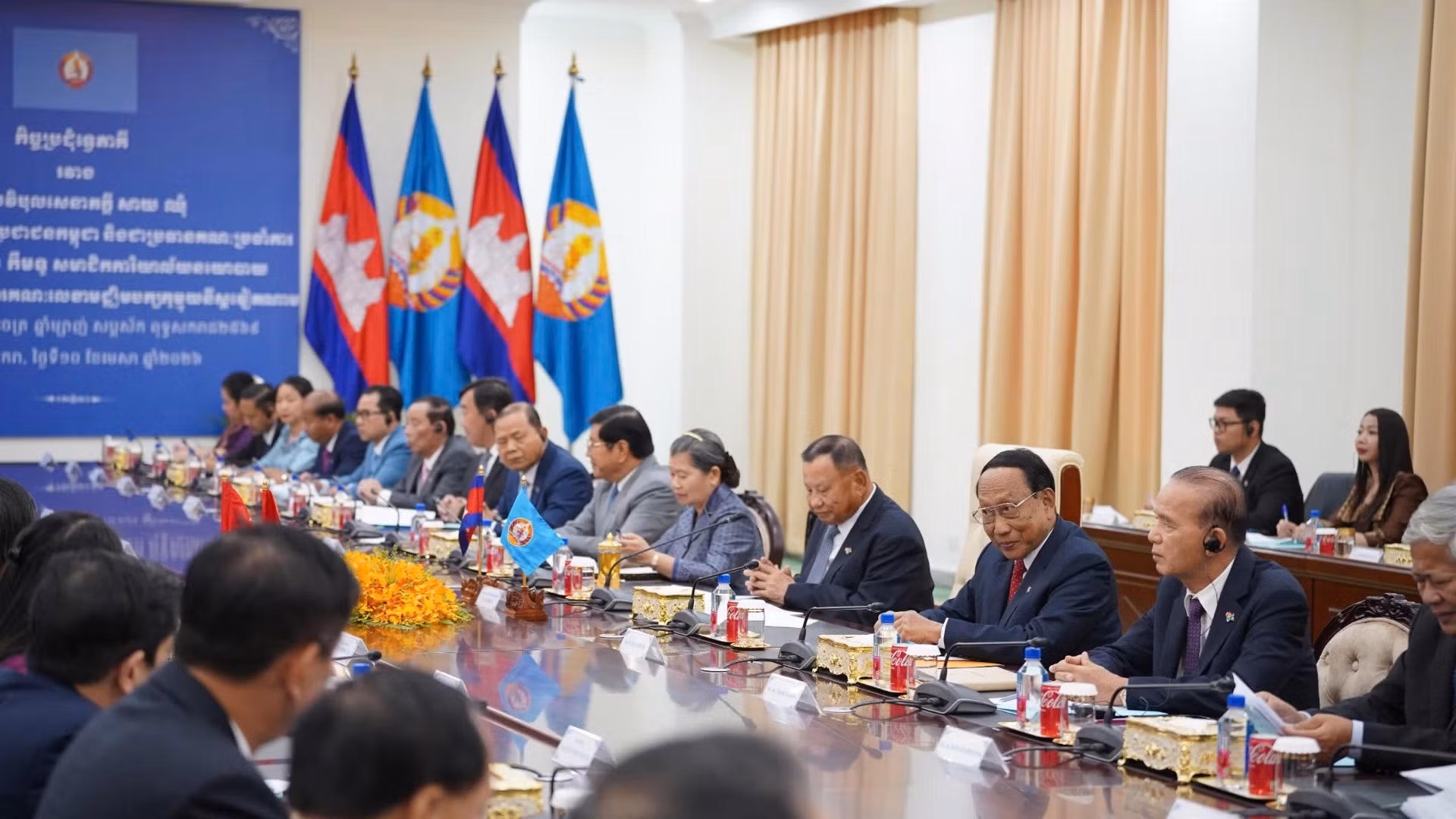 Samdech Say Chhum chúc mừng những thành tựu to lớn, toàn diện mà Việt Nam đã đạt được trong thời gian qua, nhất là đã tổ chức thành công Đại hội XIV, bầu cử Quốc hội khóa XVI và kiện toàn các chức danh lãnh đạo chủ chốt.