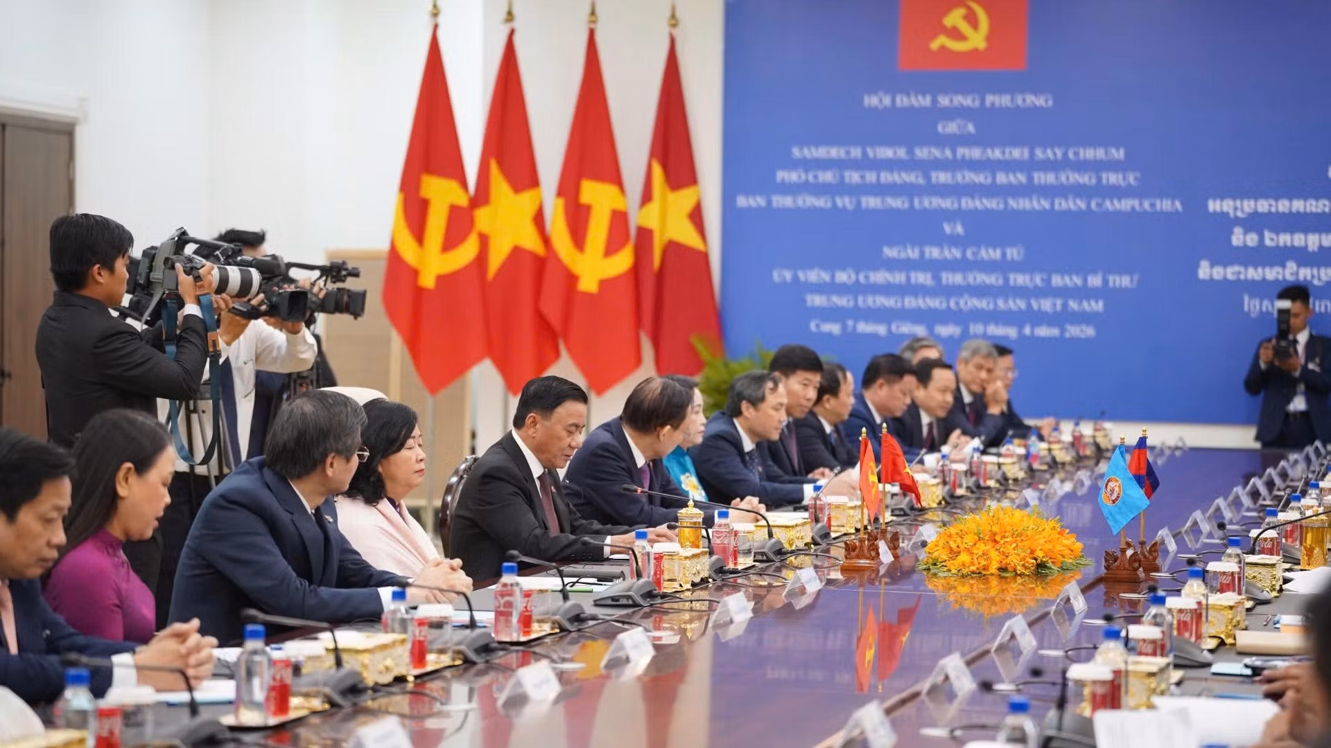 Sáng 10/4, tại thủ đô Phnom Penh, sau lễ đón chính thức trọng thể, đồng chí Thường trực Ban Bí thư Trần Cẩm Tú và Trưởng Ban Thường trực Ban Thường vụ Trung ương Đảng Nhân dân Campuchia (CPP) Samdech Say Chhum đã tiến hành hội đàm.