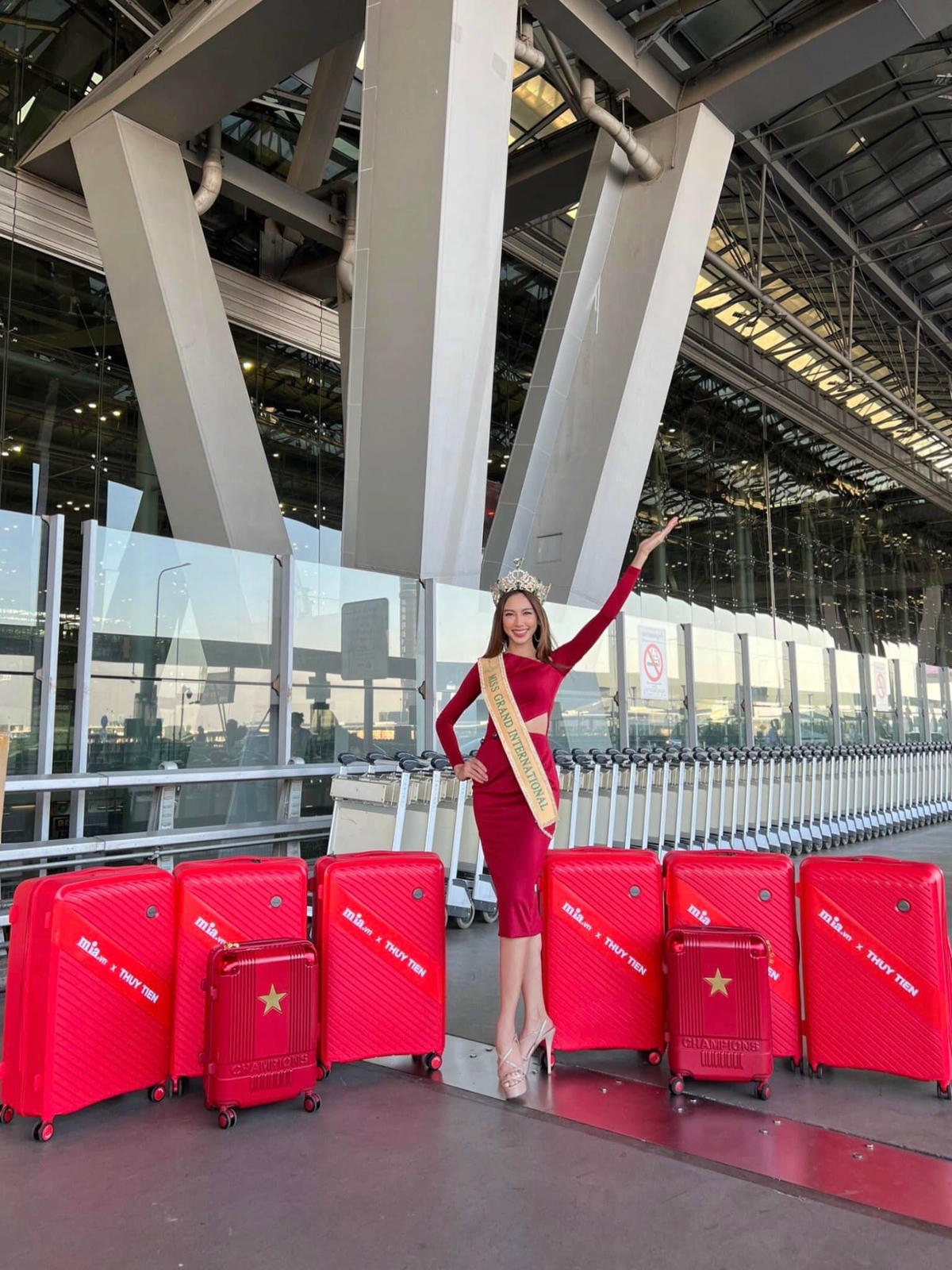 Thùy Tiên mặc trang phục cắt xẻ, đội vương miện, xuất hiện tại sân bay lên đường về nước sau hơn một tháng đăng quang.