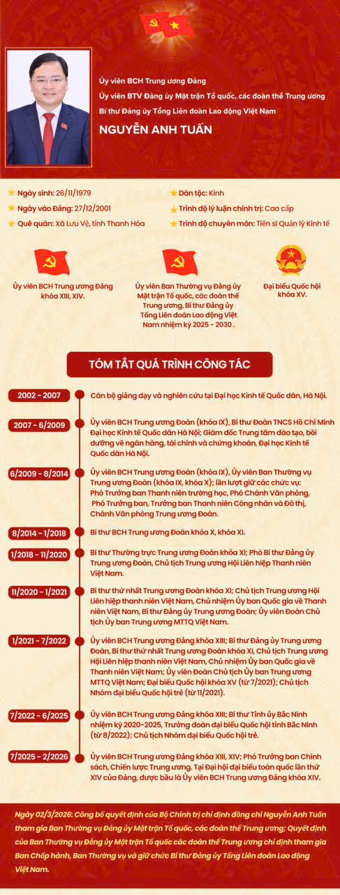 Ngày 2/3/2026 Đảng ủy Tổng Liên đoàn Lao động Việt Nam tổ chức Hội nghị công bố các quyết định của Bộ Chính trị và Ban Thường vụ Đảng ủy MTTQ, các đoàn thể Trung ương về công tác cán bộ của Đảng ủy Tổng Liên đoàn, chỉ định đồng chí Nguyễn Anh Tuấn tham gia Ban Chấp hành, Ban Thường vụ và giữ chức Bí thư Đảng ủy Tổng Liên đoàn Lao động Việt Nam.