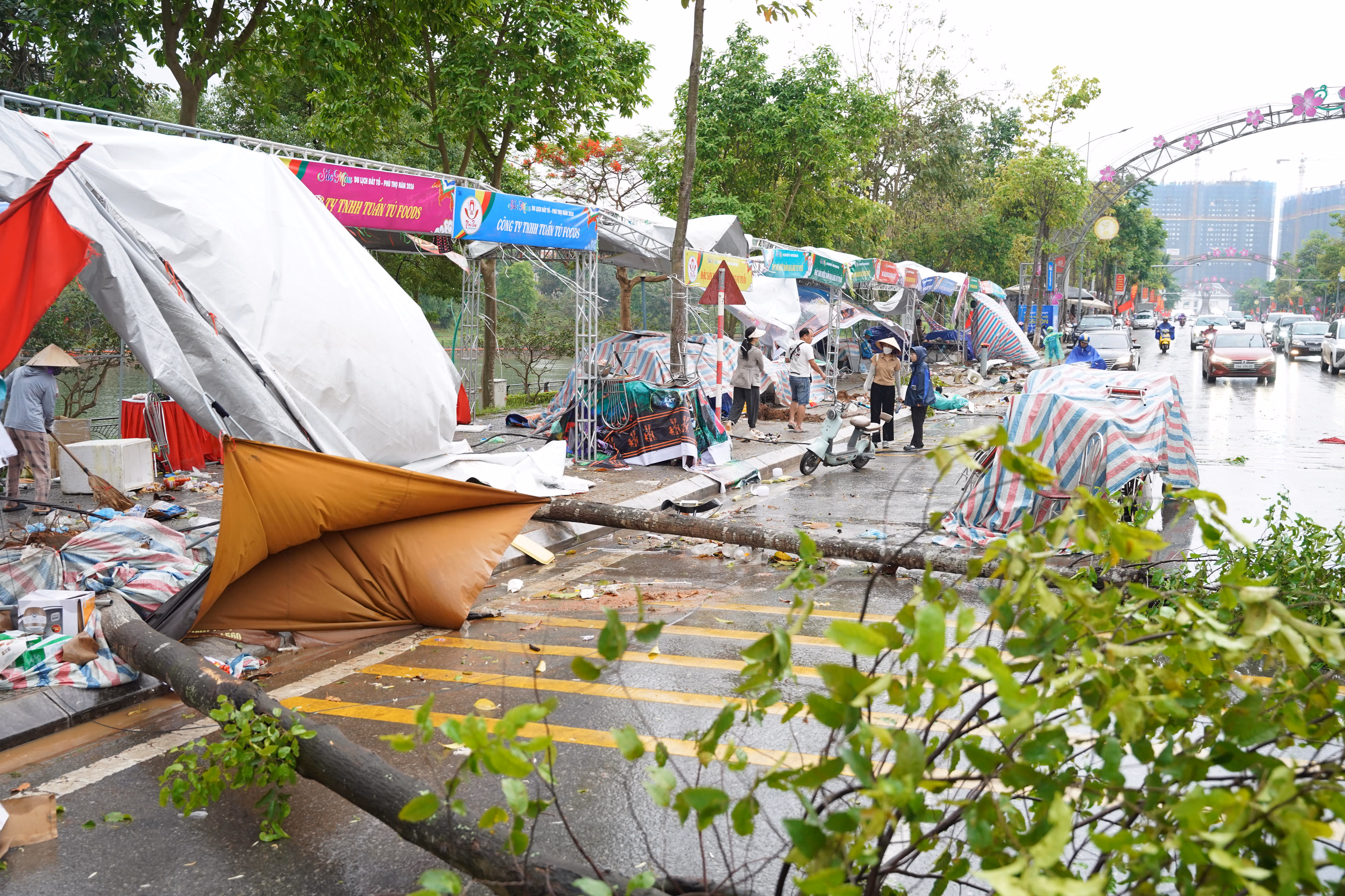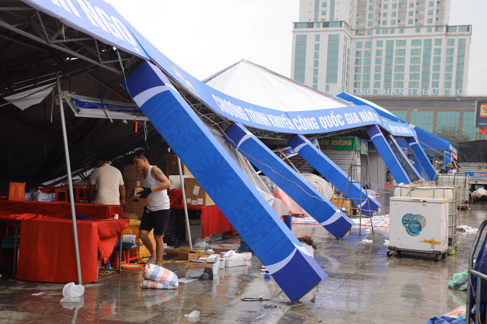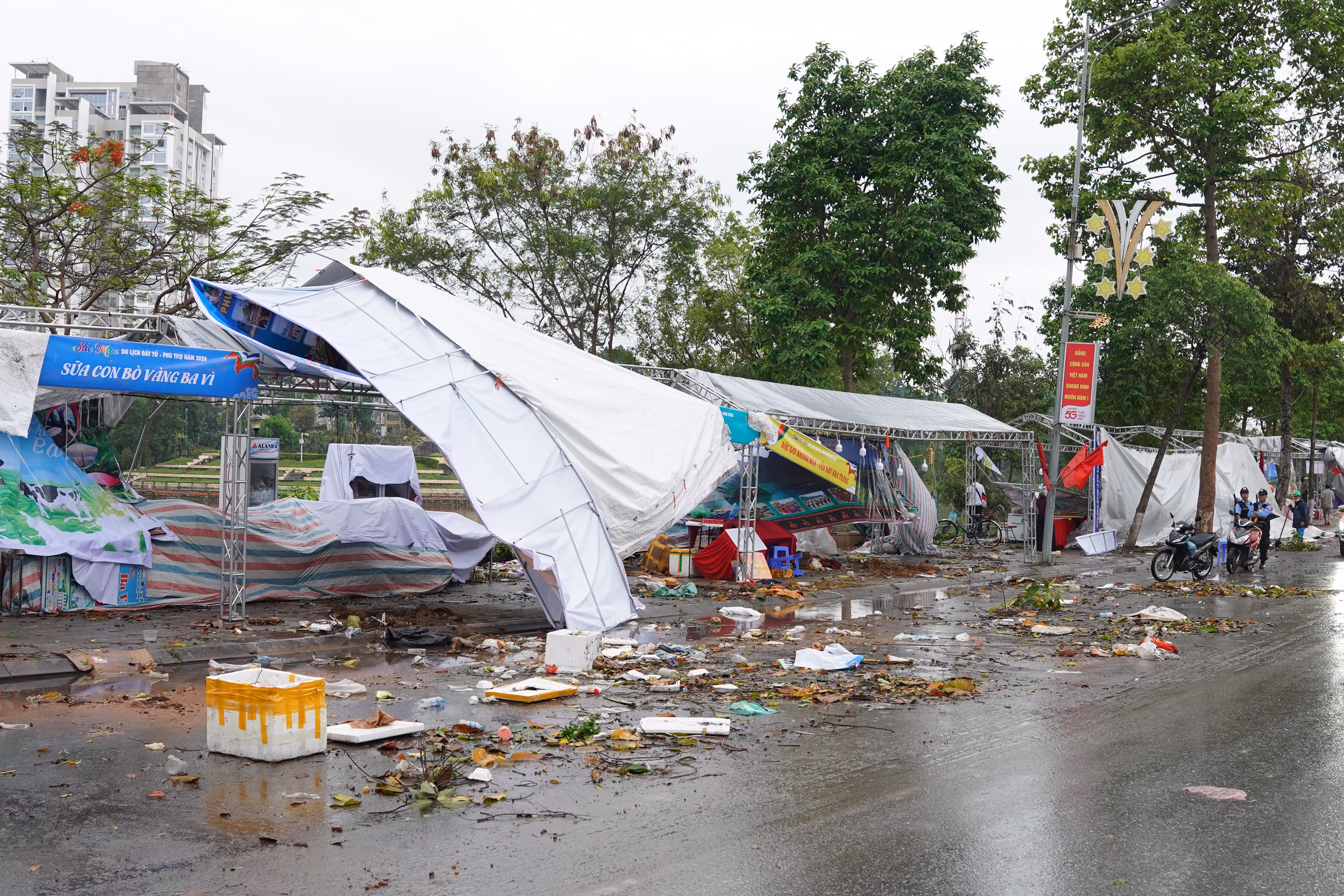 Ghi nhận dọc đường Trần Phú và quảng trường Hùng Vương, phường Việt Trì, tỉnh Phú Thọ, sau cơn mưa giông lớn rạng sáng nay, hàng loạt gian hàng của các tiểu thương tham gia Hội chợ Hùng Vương năm Bính Ngọ 2026 đã bị ảnh hưởng lớn nhưng không gây thiệt hại nặng.