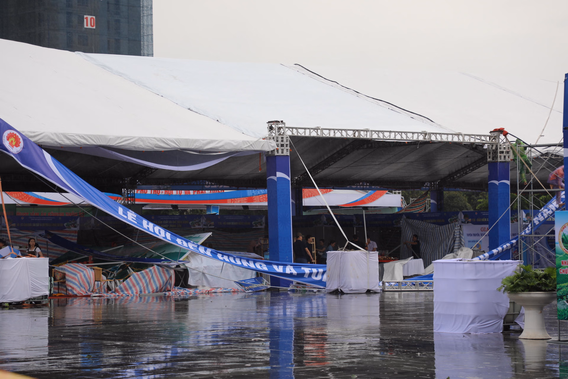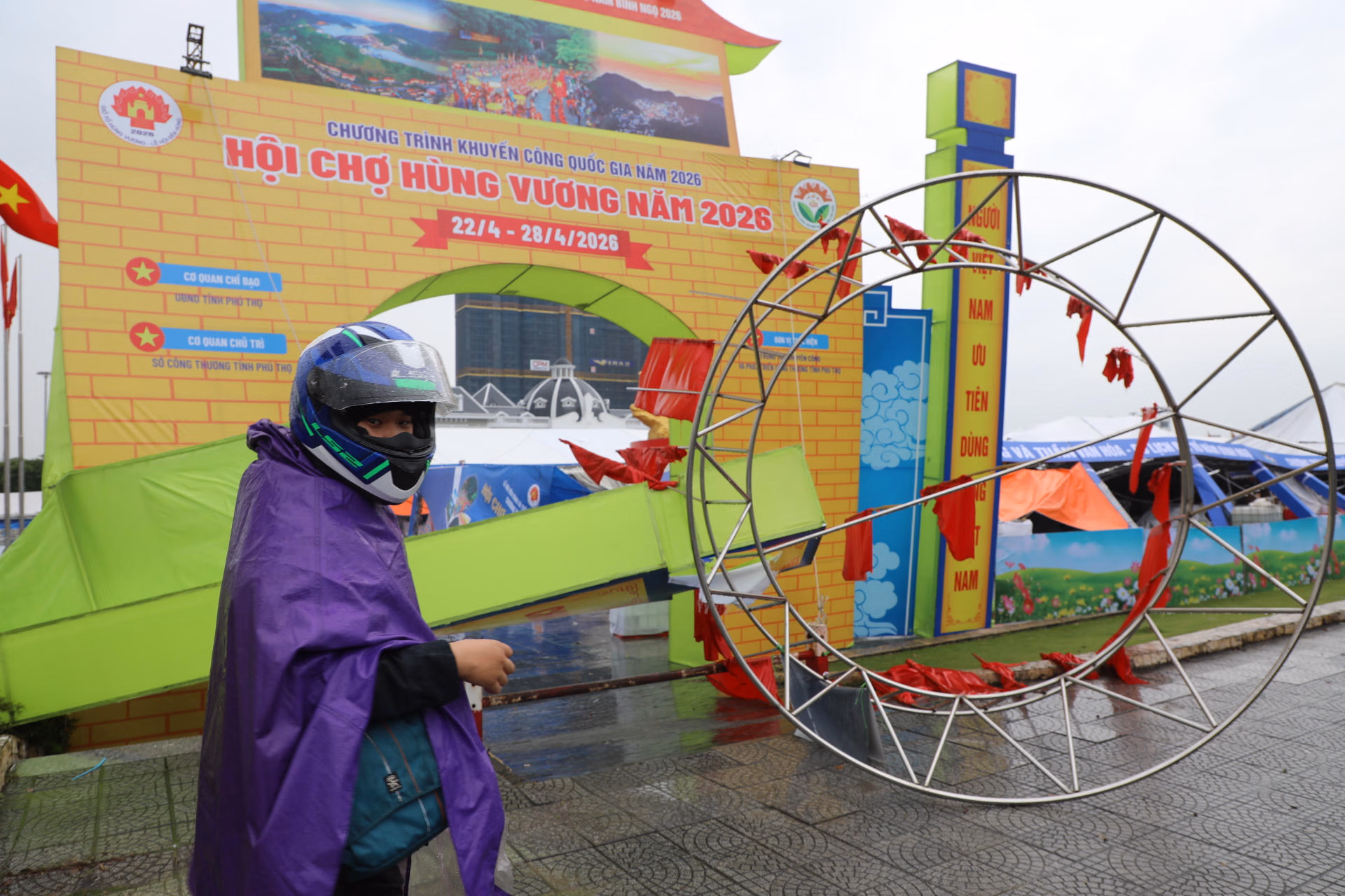Cơn mưa giông lớn rạng sáng 23/4 gây ảnh hưởng lớn đối với các gian hàng của tiểu thương tham gia Hội chợ Hùng Vương 2026 tại phường Việt Trì, tỉnh Phú Thọ.