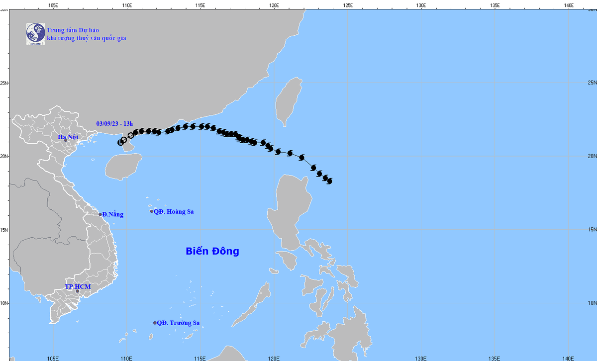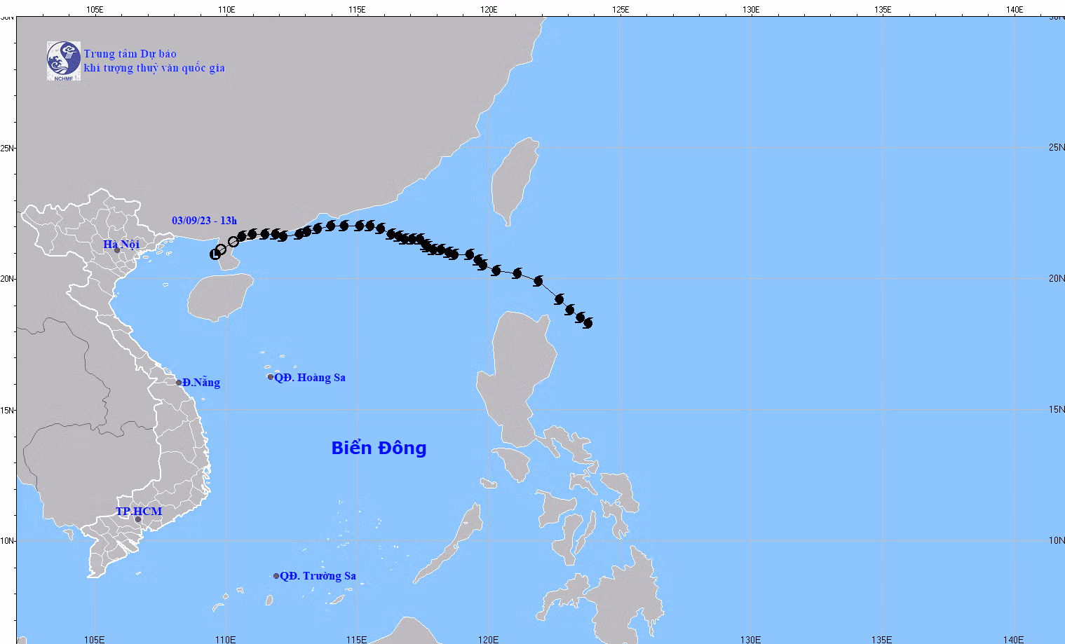 Theo Trung tâm Dự báo Khí tượng Thủy văn Quốc gia, chiều 3/9, áp thấp nhiệt đới (suy yếu từ bão số 3) đã suy yếu thành một vùng áp thấp trên vùng ven biển phía Tây Bán đảo Lôi Châu, Trung Quốc.