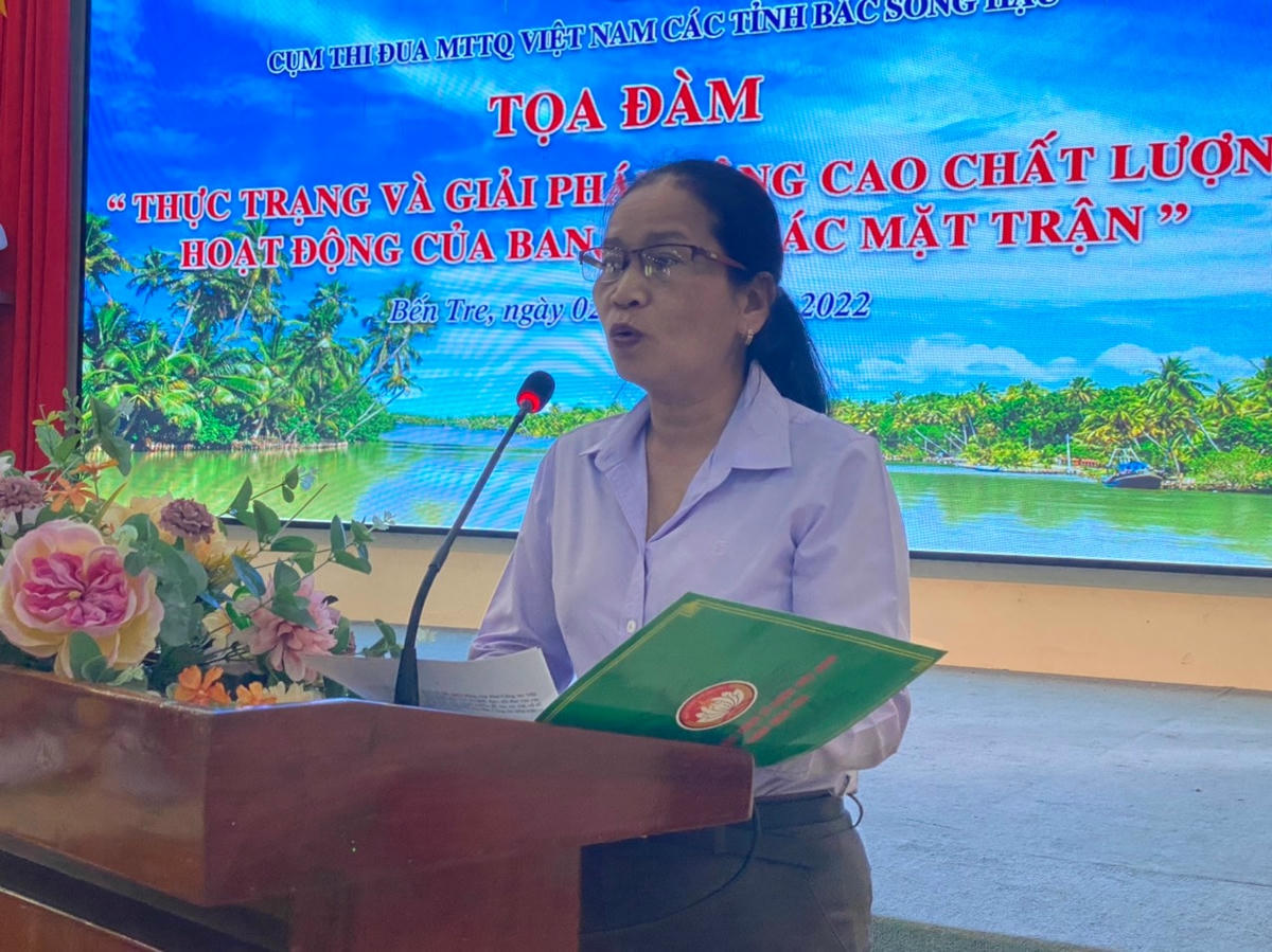 Chiều 2/8 tại TP Bến Tre (tỉnh Bến Tre), Cụm thi đua MTTQ VN các tỉnh Bắc Sông Hậu (gồm Long An, Bến Tre, Đồng Tháp, Tiền Giang, Trà Vinh và Vĩnh Long) đã tổ chức buổi tọa đàm “Thực trạng và giải pháp nâng cao chất lượng hoạt động của Ban công tác Mặt trận” nhằm nêu bật vai trò của Ban công tác Mặt trận ấp, khu phố. Chủ trì buổi tọa đàm có ông Võ Văn Thiện, Trưởng Ban Công tác phía Nam UBTƯ MTTQ VN; bà Nguyễn Thị Hồng Nhung, Chủ tịch MTTQVN tỉnh Bến Tre; ông Nguyễn Chí Trung, Chủ tịch MTTQ VN tỉnh Tiền Giang.