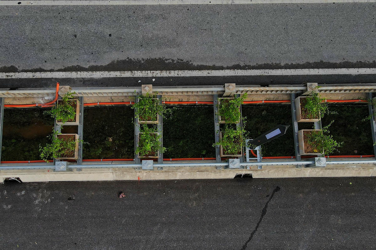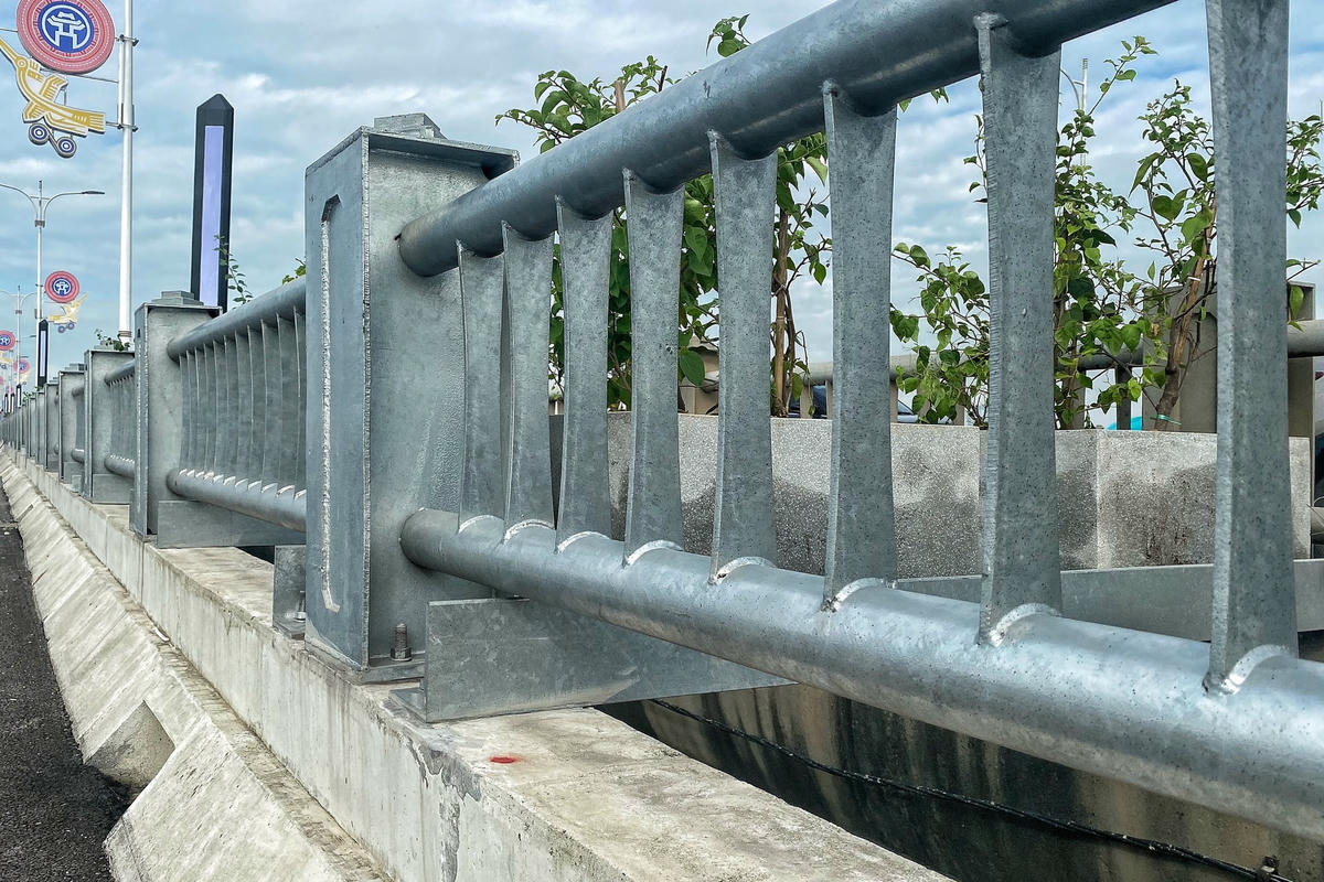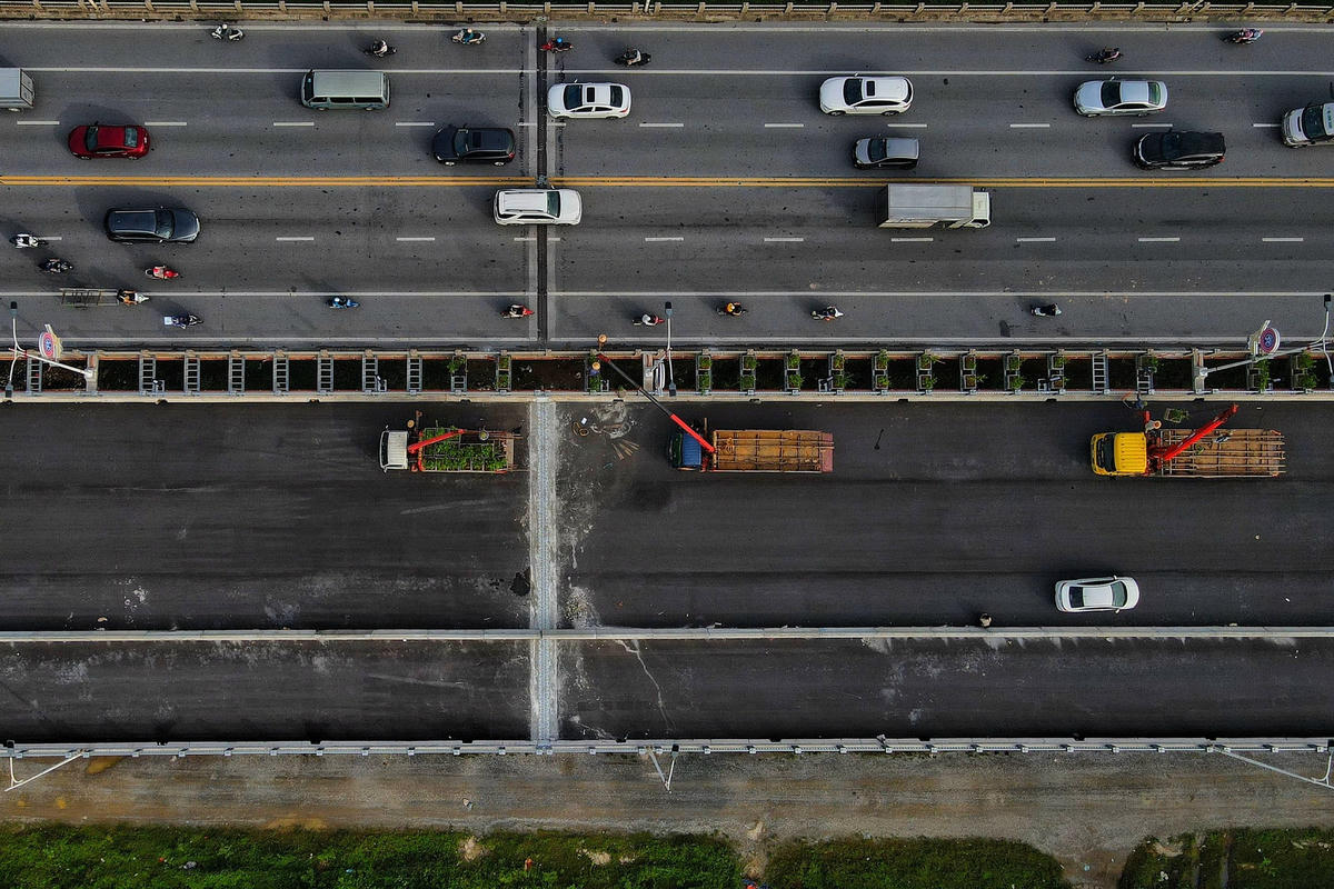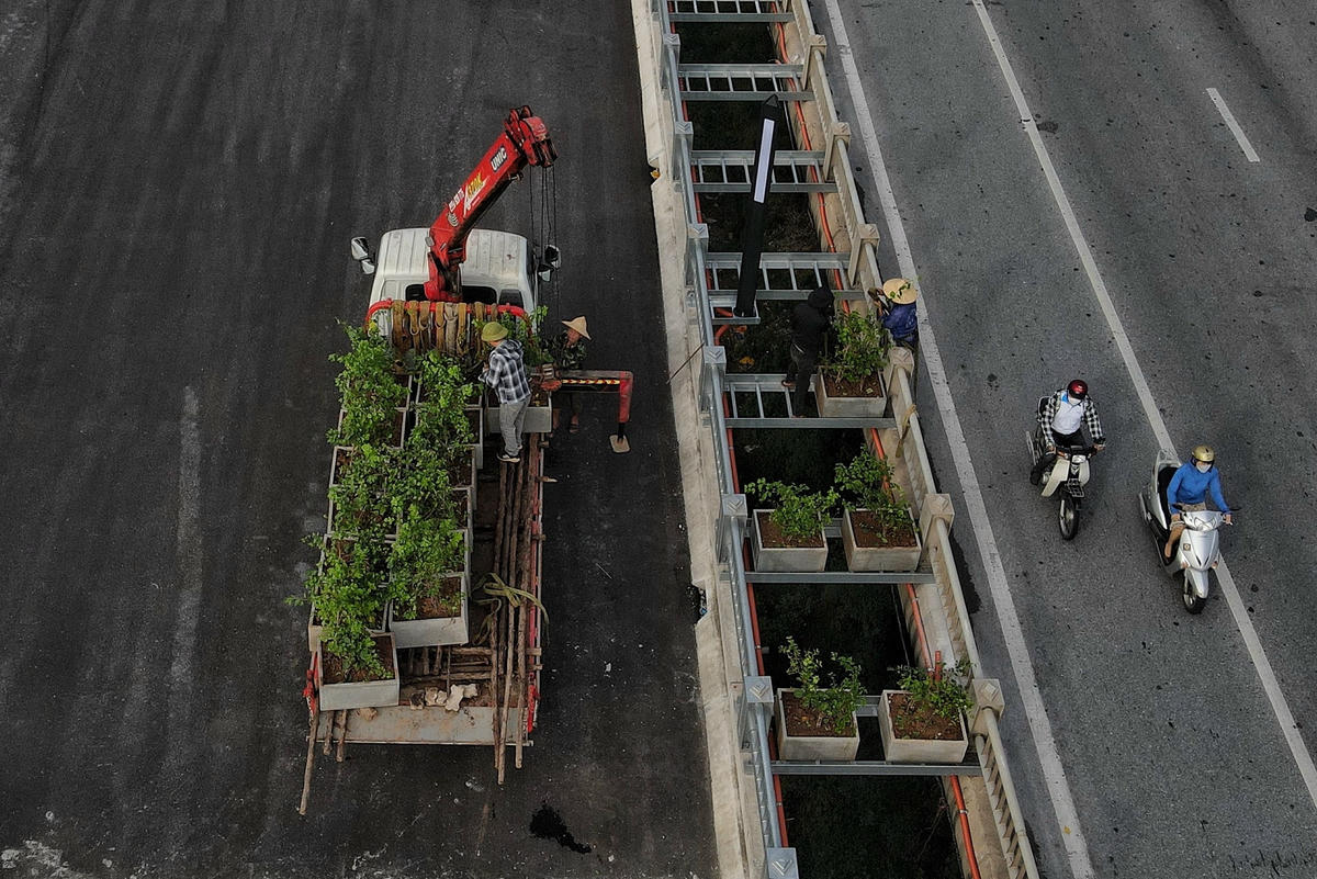 Dải phân cách giữa cầu Vĩnh Tuy 2 được trồng hàng cây hoa giấy.