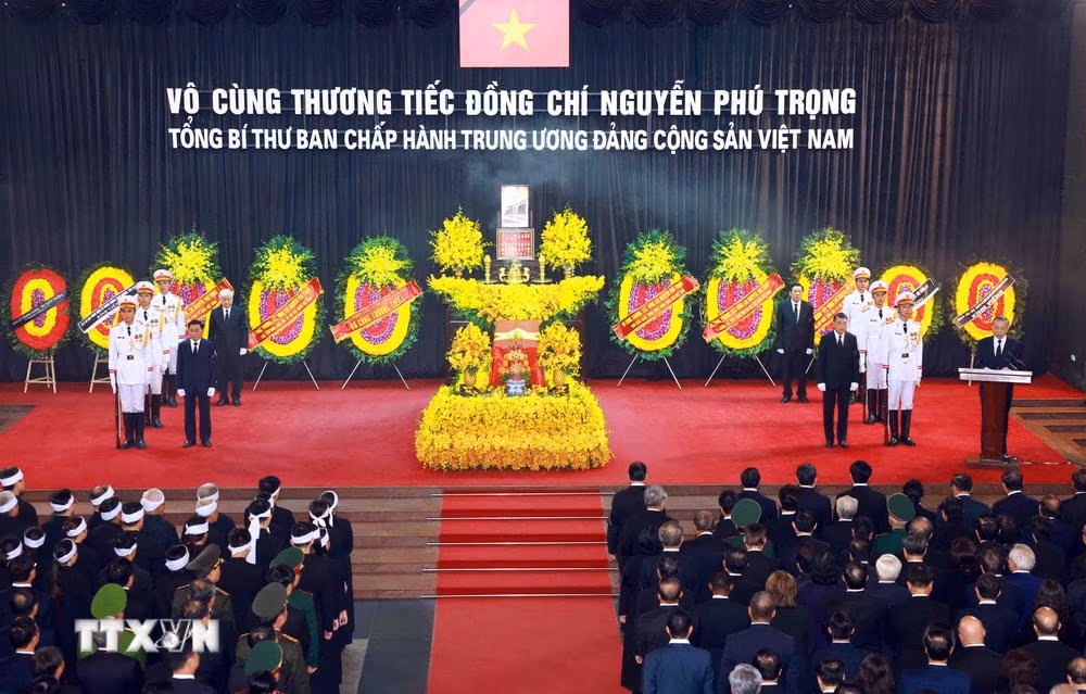 Ngày 26/7, Lễ truy điệu đồng chí Nguyễn Phú Trọng, Tổng Bí thư Ban Chấp hành Trung ương Đảng Cộng sản Việt Nam được cử hành trọng thể theo nghi thức Quốc tang tại Nhà tang lễ Quốc gia, số 5 Trần Thánh Tông (Hà Nội), đồng thời Lễ truy điệu cũng được tổ chức tại Hội trường Thống Nhất (Thành phố Hồ Chí Minh) và quê nhà Tổng Bí thư tại xã Đông Hội, huyện Đông Anh (Hà Nội).