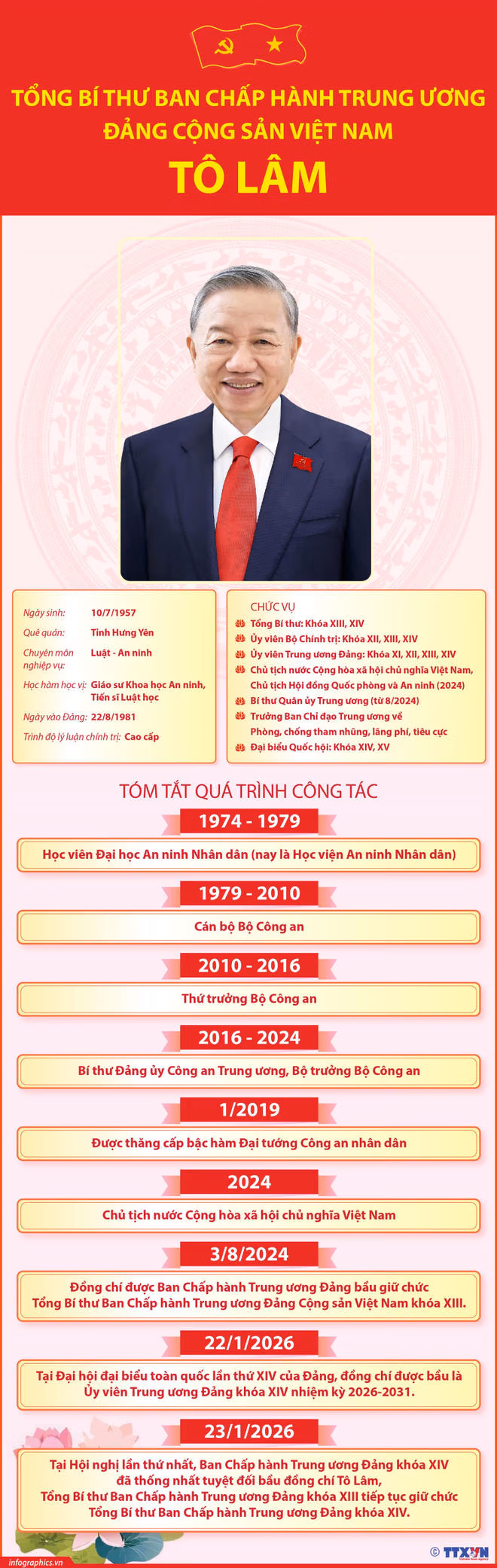 - Ngày 23/1/2026: Tại Hội nghị lần thứ nhất, Ban Chấp hành Trung ương Đảng khóa XIV đã thống nhất tuyệt đối bầu đồng chí Tô Lâm, Tổng Bí thư Ban Chấp hành Trung ương Đảng khóa XIII tiếp tục giữ chức Tổng Bí thư Ban Chấp hành Trung ương Đảng khóa XIV.