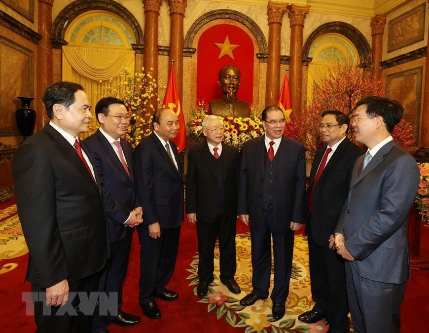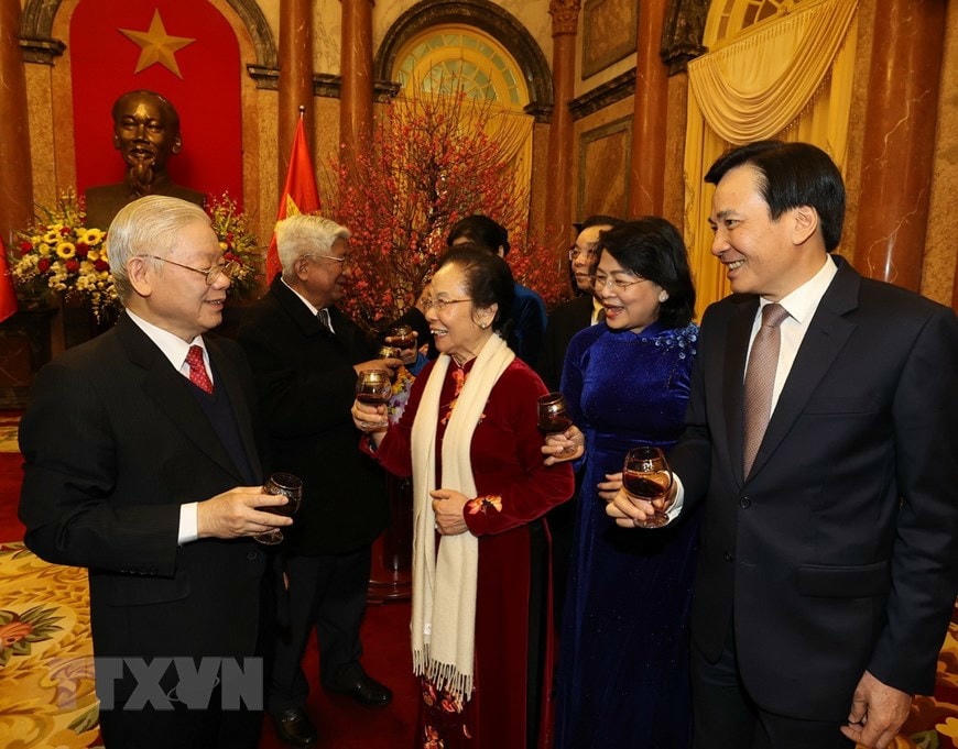 Tổng Bí thư, Chủ tịch nước Nguyễn Phú Trọng chúc Tết các lão thành Cách mạng, các lãnh đạo và nguyên lãnh đạo Đảng, Nhà nước, Mặt trận Tổ quốc Việt Nam, cán bộ lãnh đạo các cơ quan Trung ương và Hà Nội cùng toàn thể đồng bào, đồng chí và chiến sỹ cả nước, cộng đồng người Việt Nam ở nước ngoài. (Ảnh: Trí Dũng/TTXVN)