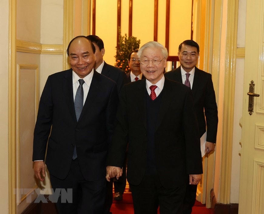 Tổng Bí thư, Chủ tịch nước Nguyễn Phú Trọng và Thủ tướng Nguyễn Xuân Phúc đến dự buổi chúc Tết. (Ảnh: Trí Dũng/TTXVN)