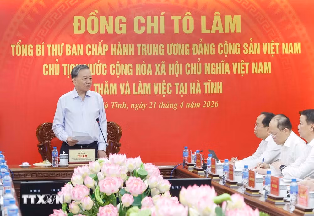 Chiều 21/4, tại Hà Tĩnh, Tổng Bí thư, Chủ tịch nước Tô Lâm và Đoàn công tác Trung ương đã làm việc với Ban Thường vụ Tỉnh ủy Hà Tĩnh về tình hình, kết quả triển khai thực hiện Nghị quyết Đại hội XIV của Đảng, Đại hội XX của Đảng bộ tỉnh; các chủ trương, nghị quyết chiến lược của Trung ương và định hướng nhiệm vụ chiến lược phát triển tỉnh Hà Tĩnh trong thời gian tới.