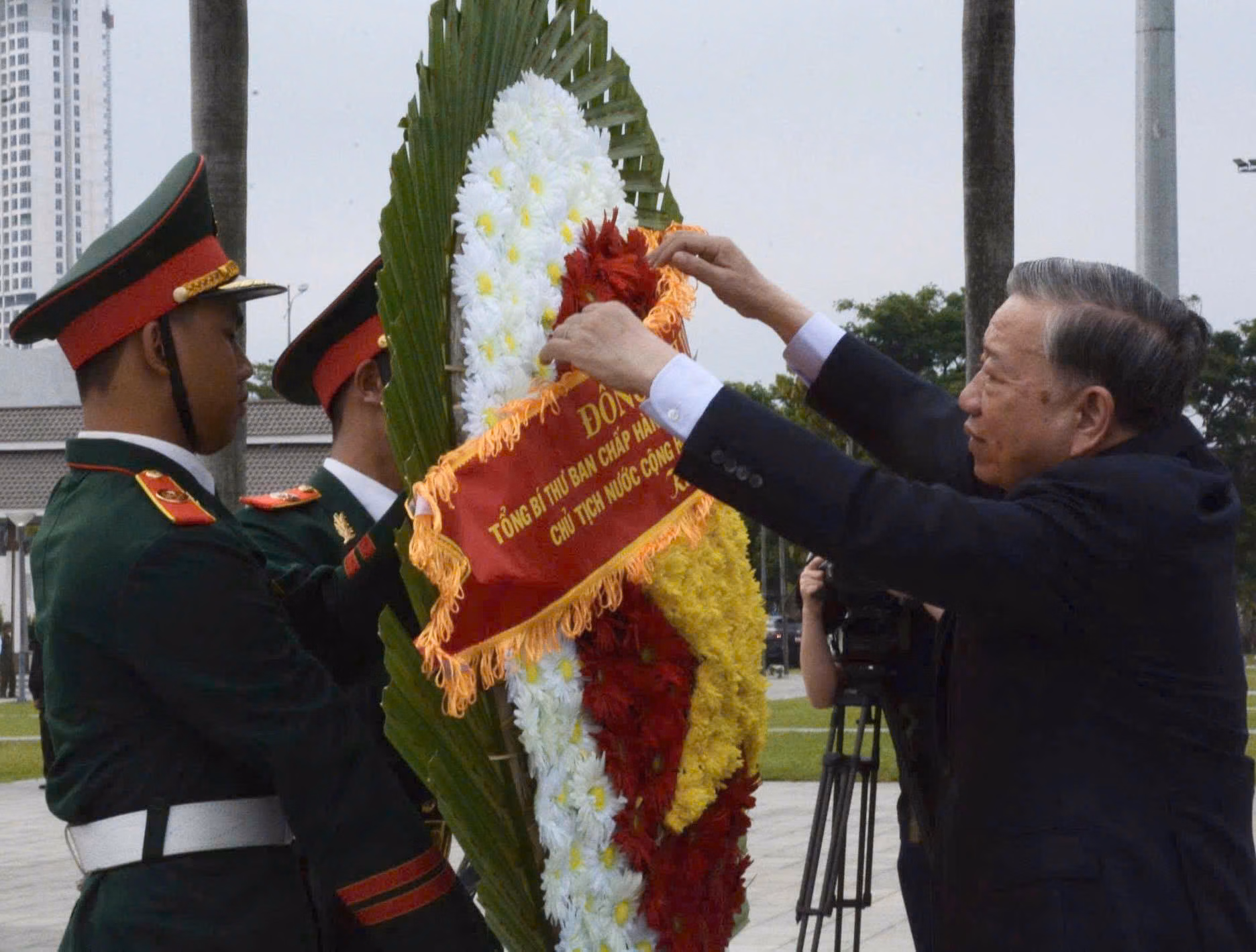 Cũng trong ngày 25/4, Tổng Bí thư, Chủ tịch nước Tô Lâm cùng đoàn công tác đã đến viếng, dâng hương tưởng niệm các Anh hùng liệt sĩ tại Đài Tưởng niệm thành phố (đường 2/9, phường Hòa Cường).
