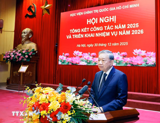 Phát biểu chỉ đạo Hội nghị, Tổng Bí thư Tô Lâm đánh giá cao và trân trọng ghi nhận những nỗ lực to lớn, tinh thần trách nhiệm cao, sự cống hiến bền bỉ và đầy tâm huyết của toàn hệ thống Học viện trong năm 2025 - một năm có ý nghĩa đặc biệt quan trọng trong tổng kết 40 năm Đổi mới, chuẩn bị Đại hội đại biểu toàn quốc lần thứ XIV của Đảng và định hình những nền tảng chiến lược cho kỷ nguyên phát triển mới của đất nước; nhấn mạnh không chỉ là tổng kết một năm công tác, mà còn là dịp rà soát, hiệu chỉnh tư duy, chuẩn bị về trí tuệ, đội ngũ và phương pháp hành động cho chặng đường phát triển sắp tới.