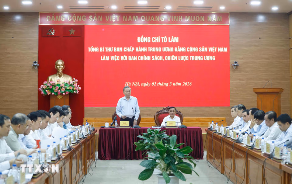 Tổng Bí thư Tô Lâm làm việc với Ban Chính sách, chiến lược Trung ương Thứ Hai 02/03/2026 18:12 (GMT+7) Chiều 2/3/2026, tại Hà Nội, Tổng Bí thư Tô Lâm làm việc với Ban Chính sách, chiến lược Trung ương. Tổng Bí thư Tô Lâm phát biểu. (Ảnh: Thống Nhất/TTXVN)Tổng Bí thư Tô Lâm phát biểu. (Ảnh: Thống Nhất/TTXVN)Tổng Bí thư Tô Lâm phát biểu. (Ảnh: Thống Nhất/TTXVN)Tổng Bí thư Tô Lâm phát biểu. (Ảnh: Thống Nhất/TTXVN)Các đại biểu dự cuộc làm việc. (Ảnh: Thống Nhất/TTXVN)Các đại biểu dự cuộc làm việc. (Ảnh: Thống Nhất/TTXVN)Tổng Bí thư Tô Lâm phát biểu. (Ảnh: Thống Nhất/TTXVN) TheoVietnam+ (VietnamPlus)