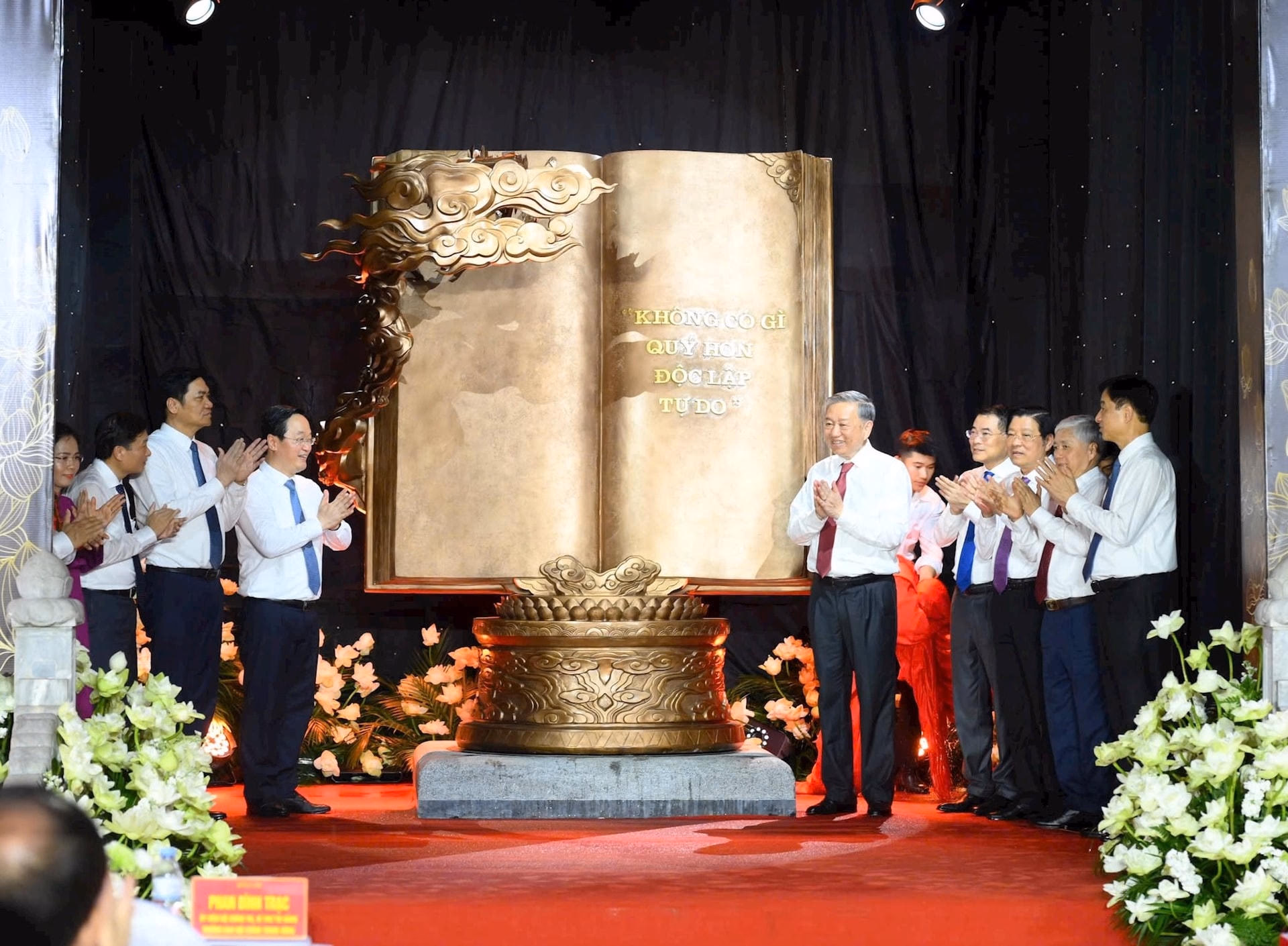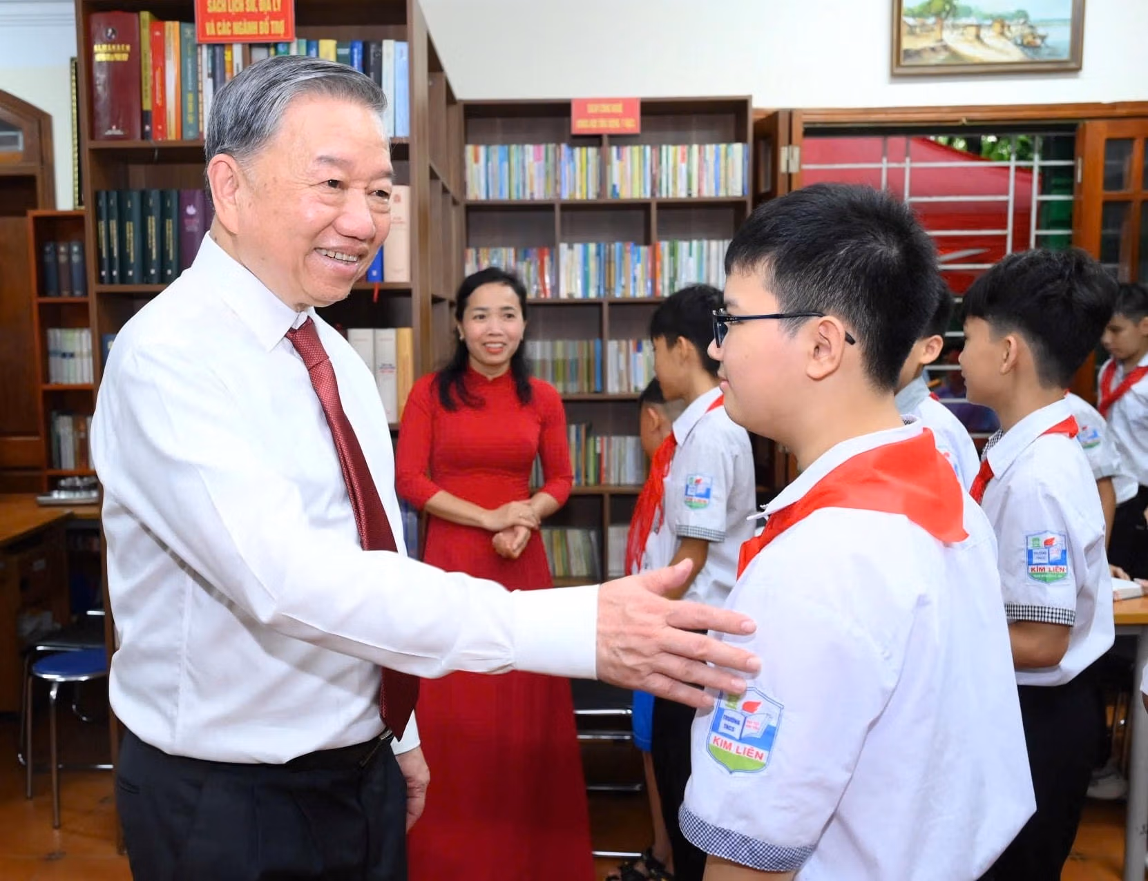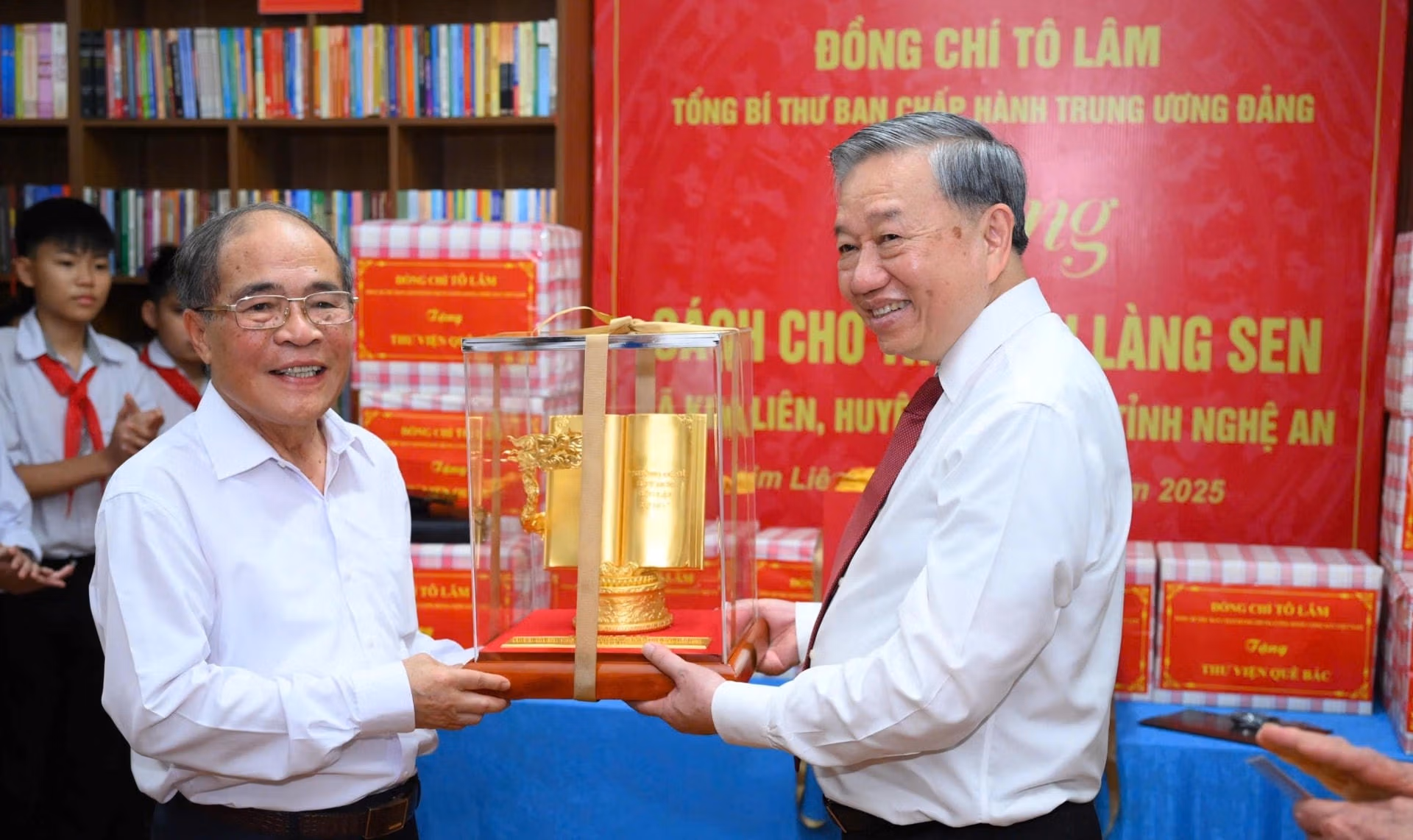 Tại đây, Tổng Bí thư Tô Lâm đã trao tặng mô hình tác phẩm điêu khắc “Việt Nam – những trang sử vàng” cho Thư viện Làng Sen, như một món quà tri ân và khích lệ tinh thần học tập, gìn giữ văn hóa đọc nơi quê Bác. Tổng Bí thư cũng đã thân mật trò chuyện, động viên các cháu học sinh, gửi gắm niềm tin vào thế hệ trẻ – những người sẽ tiếp tục viết tiếp những trang sử vàng trong thời đại mới.