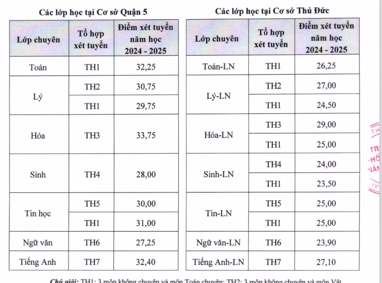 Trong khi đó, điểm chuẩn vào các lớp chuyên của trường trong năm học 2024-2025 ở từng môn được thông báo như sau. Từ kết quả này, thí sinh cũng biết được kết quả dự thi của bản thân.