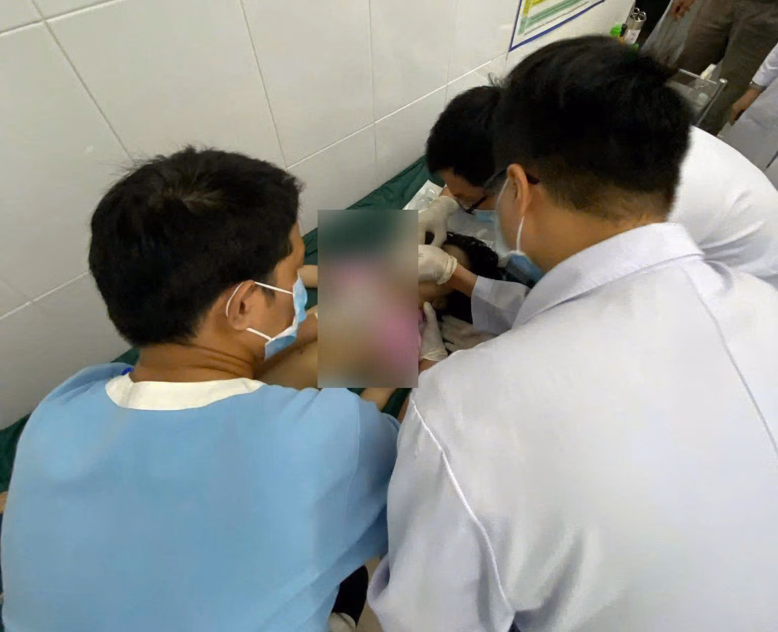 Sau đó, Trạm Y tế phường Phú Định chẩn đoán bé ngưng tim, ngưng thở ngoại viện và đã xử trí bằng cách ấn tim ngoài lồng ngực, bóp bóng oxy qua mask 4 l/p, tiêm Adrenalin 1% 1mg/1 ml ống x 2 lần tiêm bắp… Đồng thời gọi Cấp cứu 115. Sau đó, Trung tâm cấp cứu 115 đã đưa kíp cấp cứu đến, ghi nhận bé đã hôn mê, ngưng tim, ngưng thở nằm trên băng ca được hồi sinh tim phổi. Sau 70 phút hồi sinh tim phổi tích cực trên monitor nhưng bệnh nhi đã không qua khỏi.