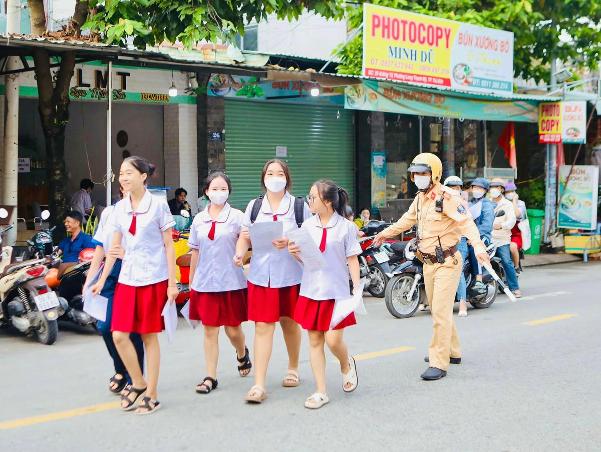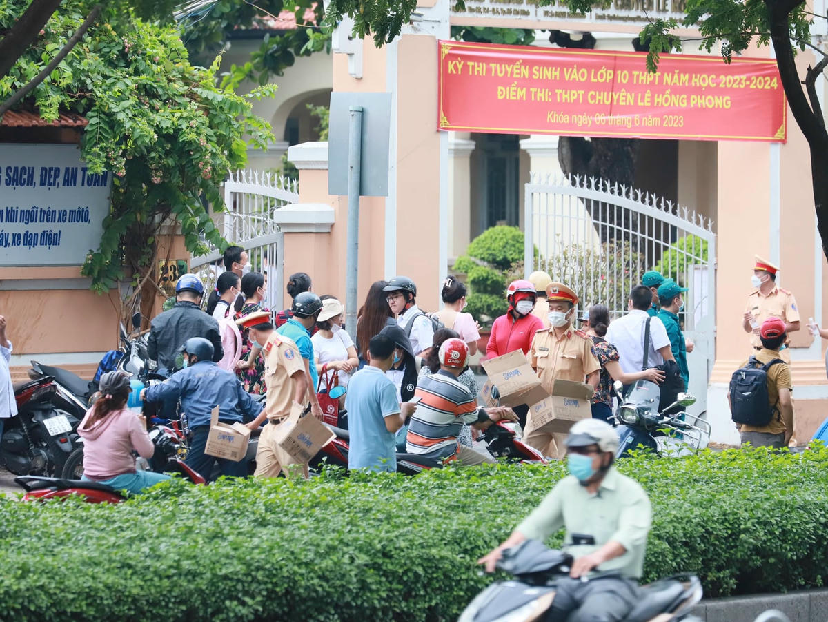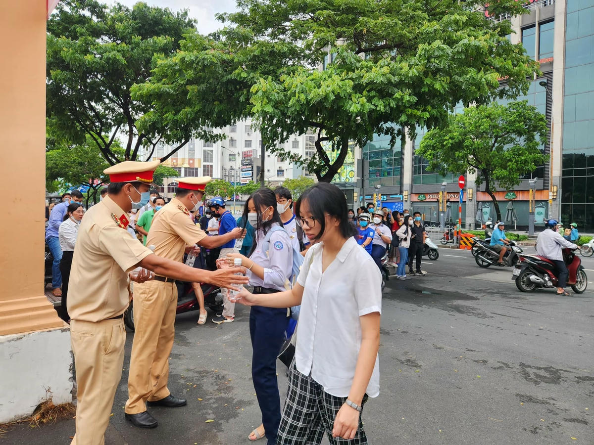 Ở một số điểm thi như tại điểm thi THPT chuyên Lê Hồng Phong trên đường Nguyễn Văn Cừ (quận 5), các cán bộ, chiến sĩ còn phát nước suối hỗ trợ các em thí sinh vào điểm thi. Tại địa bàn TP Thủ Đức, các CSGT túc trực, làm nhiệm vụ phân luồng giao thông, không để phát sinh các tình huống giao thông phức tạp tại điểm thi Trường THPT Nguyễn Huệ - T.039 (TP Thủ Đức) từ lúc 6 giờ sáng.
