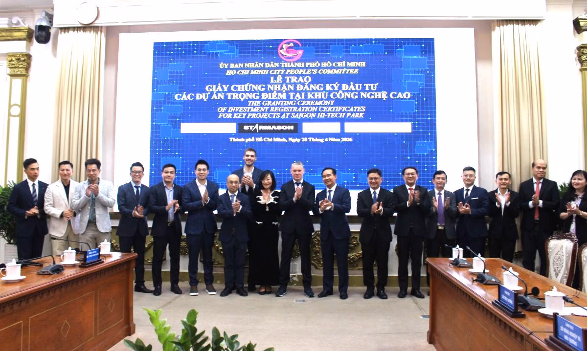 Ngày 25/4, UBND TP Hồ Chí Minh tổ chức Lễ trao giấy chứng nhận đăng ký đầu tư cho 4 dự án với tổng vốn hơn 1,23 tỷ USD, tập trung vào các lĩnh vực mũi nhọn như vi mạch bán dẫn, trung tâm dữ liệu và công nghệ vi sinh, tiếp tục khẳng định sức hút của môi trường đầu tư thành phố.