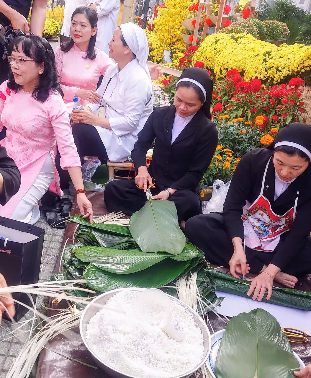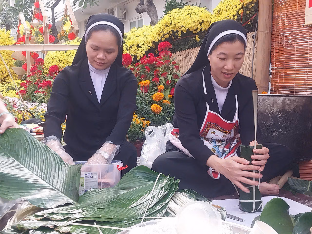 Cùng chung tinh thần đó, tại Bệnh viện Chợ Rẫy, các sơ Dòng Mến Thánh Giá Chợ Quán đã tham gia gói bánh chưng, bánh tét tặng bệnh nhân.