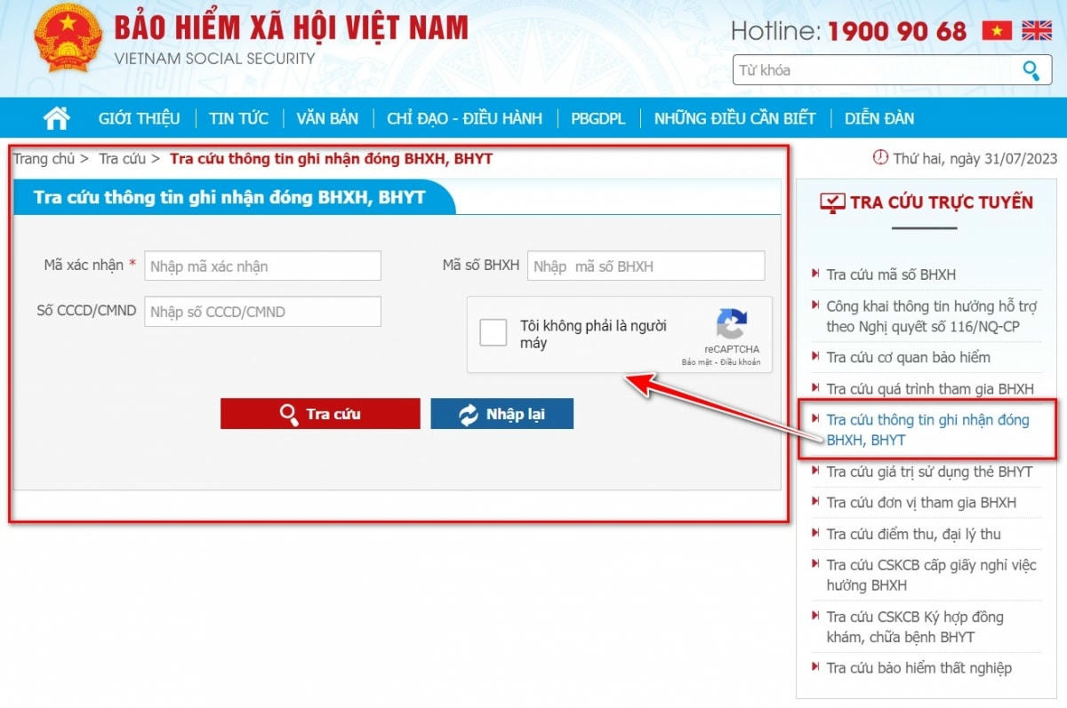Bước 3: Chọn chức năng Tra cứu thông tin ghi nhận đóng BHXH, BHYT.