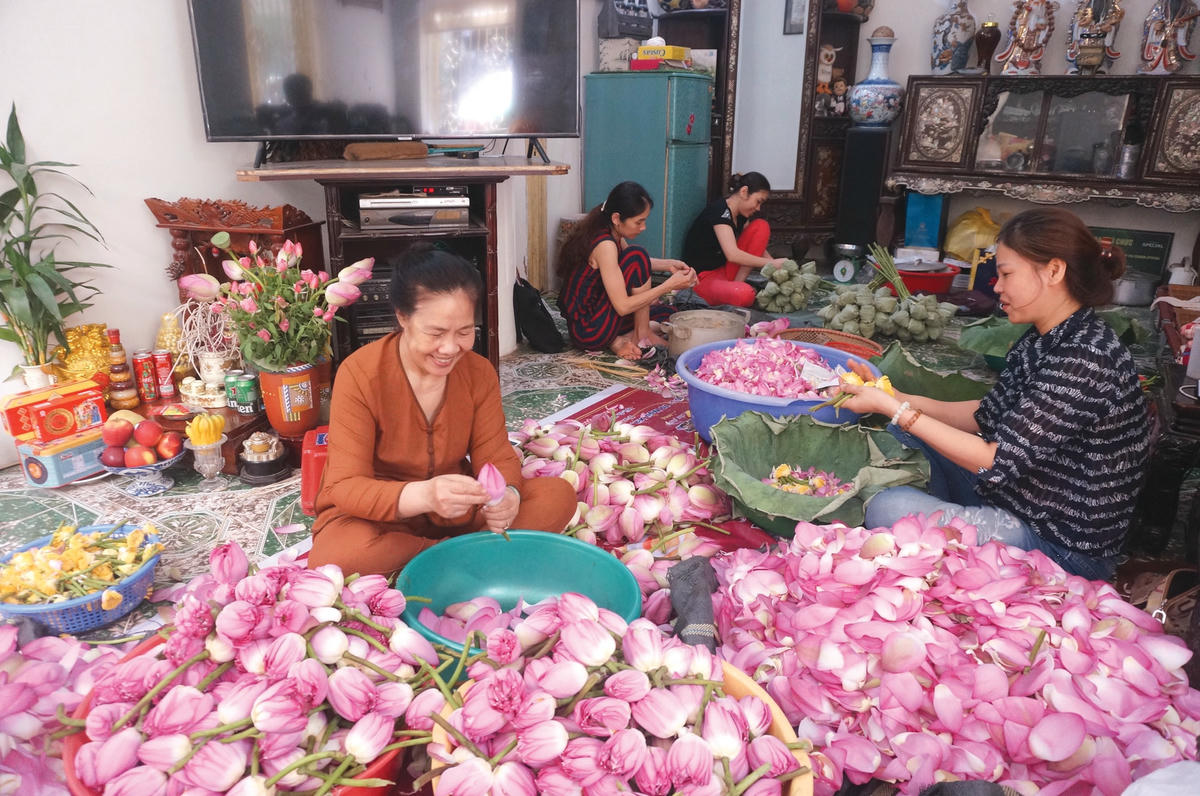 Bây giờ, nhịp sống công nghiệp, công việc mỗi người thường bề bộn, không mấy ai có đủ thời gian cho công việc tỉ mẩn ấy. Nhưng Hà Nội vẫn luôn còn những gia đình ướp trà sen truyền đời. Ngay bên hồ Tây, những người dân làng Quảng An xưa cũng có nghề ướp trà. Bây giờ, hình thành cả một Hợp tác xã, gồm những hộ gia đình chuyên nghề ướp trà sen. Sen thu hái về, người ta tách gạo sen ra. Gạo sen được ví là cái “túi hương” của bông sen. Cứ mỗi lần trà, rải một lượt gạo sen. Rồi lại một lần trà, một lần gạo sen như thế… Đấy gọi là quá trình “vào hương”. Hương sen ở “gạo” được nhốt chung với trà, thẩm thấu sang những cánh trà khô. Thế là những thứ tinh túy nhất của đất trời đều đọng cả vào cánh trà. Sau một lần vào hương, thì lại tách gạo sen ra, sấy khô. Sau đó “vào hương” tiếp. Người ta thường phải làm sáu, bảy lần thì xong một mẻ trà. Người “cao tay” sấy bằng than hoa, nhưng kỹ thuật này bây giờ đã thất truyền, hầu như không ai làm được.