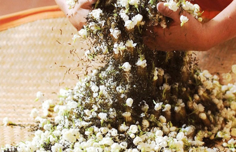 Với hoa nhài, hoa bưởi, hay hoa sói... Cách ướp cũng có phần giống hoa sen. Cứ một lượt trà, một lượt hoa, ủ kín cho đến độ thẩm thấu thì mới dỡ ra, sấy và ướp tiếp. Nhưng với sen, sau mỗi lượt ướp sen, chỉ cần sàng trà là tách được gạo sen. Hoa bưởi, hoa nhài có tiếng là ướp đơn giản hơn, vì chỉ cần vào hương độ đôi ba lần, nhưng lại tỉ mẩn ở chỗ, cánh bưởi, cánh nhài kích cỡ ngang với cánh trà. Để lẫn thì cánh hoa “công” vị trà. Chỉ còn mỗi cách ngồi nhặt hết cánh hoa. Thế nên, tiêu chuẩn đầu tiên để có thể trở thành thợ ướp trà giỏi, là kiên trì, tỉ mẩn. Người ta hay bảo “dệt” hương cho trà, cũng bởi cái sự tẩn mẩn, kỹ càng ấy.