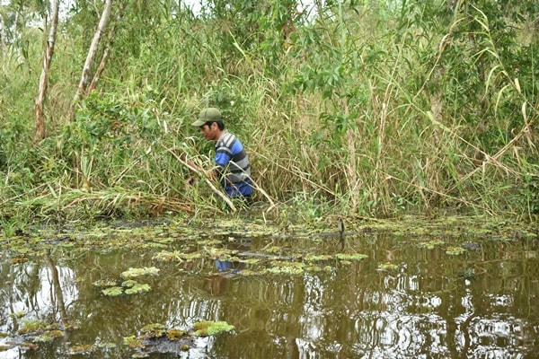 Dứt lời, anh Hoàng lấy chiếc nón kết đội lên đầu rồi xua tay: “Đi thôi”. Rồi nhanh thoăn thoắt, anh Hoàng nhảy xuống chiếc vỏ nổ máy đưa chúng tôi vào rừng. Tài điều khiển vỏ máy của anh Hoàng rất điêu luyện, con đường vào rừng vừa hẹp, dưới nước có những cánh bèo làm vật cản, nhưng anh Hoàng vẫn vững vàng điều khiển phương tiện luồng lách qua từng kênh mương để vào rừng.