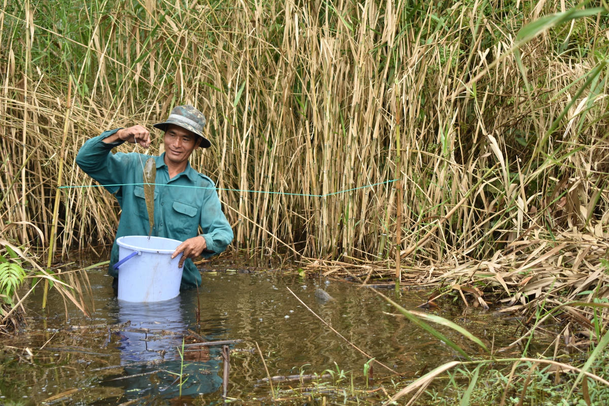 Anh Hoàng nói: “Số lờ, lọp này anh mới mua nên đặt để đó, vài ba ngày sau mình mới thăm. Chứ thăm liền chẳng có cá đâu, đặt xong anh dẫn chú đi thăm những cái lờ, lọp mà anh đặt trước đó mấy ngày. Còn câu diền, thăm lọp xong, mình quay lại là thăm được. Vì để lâu, cá dính câu sẽ sảy mất liền. Lâu lâu đi rừng, mình trải nghiệm trọn vẹn công việc của nông dân tụi anh một lần cho biết”.