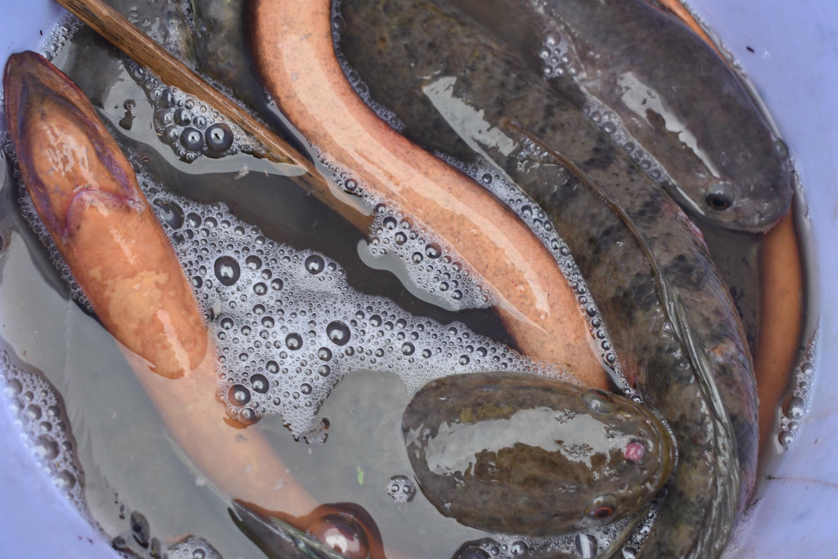 Vén lớp bèo tai chuột, lộ ra chiếc lọp thâm đen do bị ngâm nước quá lâu, thấy nặng, anh Hoàng vội nói: “Có cá lớn”. Rồi anh nhẹ nhàng nâng chiếc lọp khỏi mặt nước đưa lên vỏ lãi. Vẻ mặt hớn hở, anh Hoàng cười: “Thấy chưa, anh nói mà không sai đâu”. Những con cá lóc nặng khoảng 1kg thi nhau trườn qua lại trong lọp để tìm hướng thoát ra ngoài. Cứ thế, anh Hoàng đưa chúng tôi đi thăm lợp bắt được vô số cá lóc.