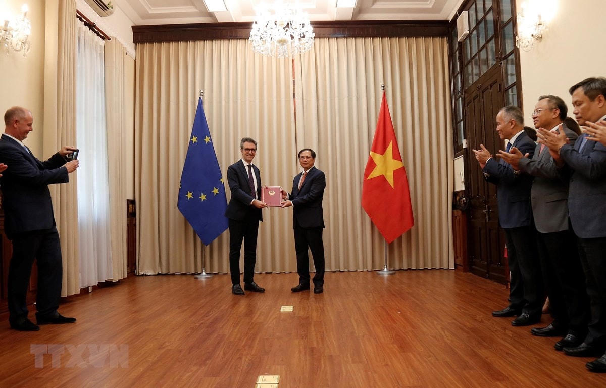 Thứ trưởng Thường trực Bộ Ngoại giao Bùi Thanh Sơn trao Công hàm thông báo phê chuẩn Hiệp định EVFTA và EVIPA cho Đại sứ, Trưởng Phái đoàn Liên minh châu Âu tại Việt Nam Pier Giorgio Aliberti. (Ảnh: Hoàng Việt/TTXVN).