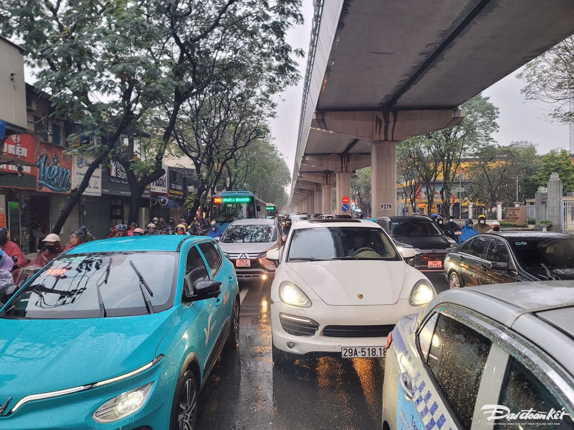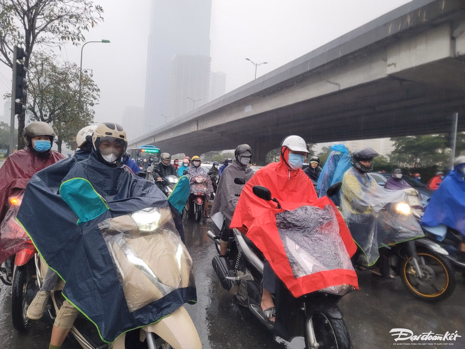 Trời mưa đường tắc, người dân 'rồng rắn' trên vỉa hè đến công sở Thứ Tư 10/01/2024 09:43 (GMT+7) Sáng 10/1, trời mưa khiến việc di chuyển khó khăn, các tuyến phố tại Hà Nội ùn tắc, nhiều người điều khiển phương tiện leo vỉa hè để kịp giờ làm. Theo Trung tâm Dự báo Khí tượng Thủy văn Quốc gia, thời tiết hôm nay (10/1) Hà Nội đón thêm không khí lạnh khiến nền nhiệt giảm sâu kèm theo mưa. Nhiệt độ dao động trong khoảng 18 - 20 độ C.Thời tiết mưa, khiến cho thời điểm 7h sáng nhưng trời vẫn hơi tối, các phương tiện phải bật đèn trong lúc di chuyển.Theo ghi nhận, vào khoảng 7h, đường Mễ Trì (quận Nam Từ Liêm, thành phố Hà Nội) phương tiện bắt đầu đông đúc.Đến 7h30, đường Mễ Trì bắt đầu ùn tắc, phương tiện ken đặc.Đường Phạm Hùng hướng Phạm Văn Đồng đi Khuất Duy Tiến ùn tắc, phương tiện xếp hàng dài.Như thường lệ, đường Dương Đình Nghệ (Cầu Giấy, Hà Nội) vào giờ cao điểm lại ùn ứ, phương tiện "nhúc nhích" từng chút một, nhiều xe máy leo lên vỉa hè tránh tắc đường.Tương tự, phố Trung Kính (Cầu Giấy, Hà Nội) ùn ứ, nhiều người điều khiển phương tiện leo lên vỉa hè di chuyển đến công sở.Anh Hoàng Nam (35 tuổi, ở Cầu Giấy) cho biết đã chuẩn bị sẵn tinh thần là sáng nay sẽ tắc đường nên anh đi làm sớm hơn thường lệ. "Ở Hà Nội, trời mưa là tắc đường, không có gì bất ngờ cả", anh Nam nói.Phố Xuân Thuỷ xảy ra tình trạng tương tự, nhiều thời điểm phương tiện không thể di chuyển.Lực lượng CSGT điều tiết giao thông tại khu vực ngã tư phố Xuân Thuỷ - Cầu Giấy - Nguyễn Phong Sắc - Trần Thái Tông.Người dân đội mưa đi làm sáng 10/1.Vòng xuyến phố Tôn Thất Thuyết giao Phạm Văn Bạch phương tiện di chuyển khó khăn. Quốc Thanh